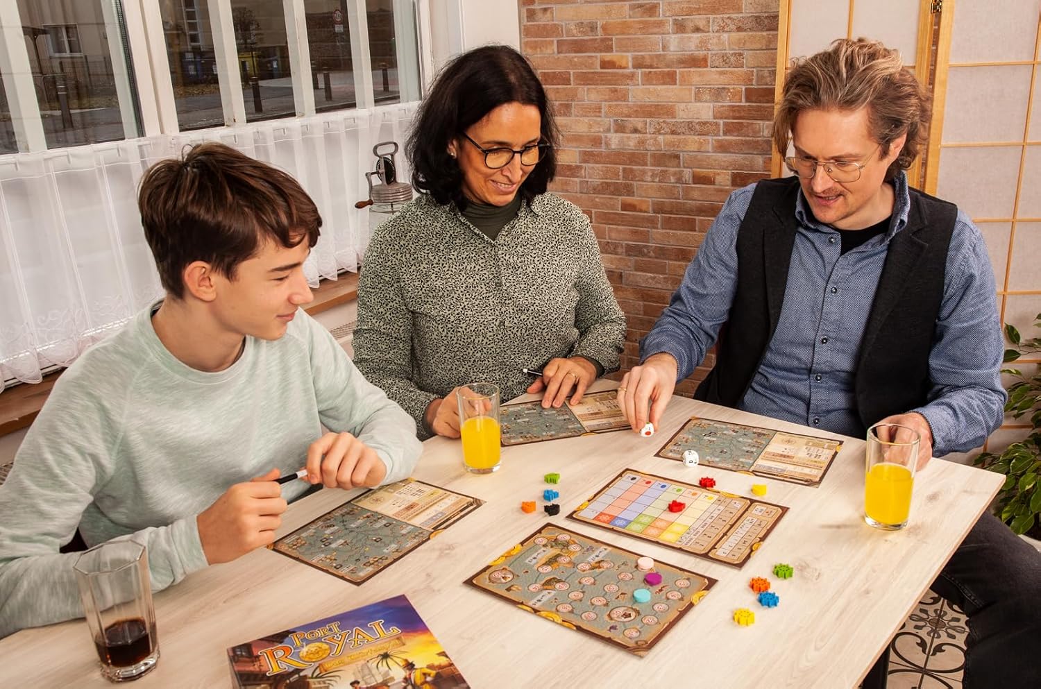 The Caribbean classic with pirate flair is back! In Port Royal – The dice game, players now exchange cards for dice and pens. However, the goal remains identical: to assemble a powerful crew and win the wide sea with it. Anyone who makes it to one of the islands can hire new crew members there and gain valuable skills with them. But beware, if you poker too high, you get a neat pinch of headwind! Port Royal - The dice game has two stages: first the dice is the turn of the dice. With each throw, the game plan fills with different coloured ship and steering wheel tokens. The more tokens, the better, and can be diced as often as you like. But if the same ship symbol appears twice and cannot be repelled by saber-rattling crew members, it is out, and the dice person goes out empty while the others at the table can fill their bags. But if she made the jump in time, she can exchange for actions on her own game plan in front of the other token(s) - either to reach new islands or to gain access to unique effects. Who will manage to sail the other players?
