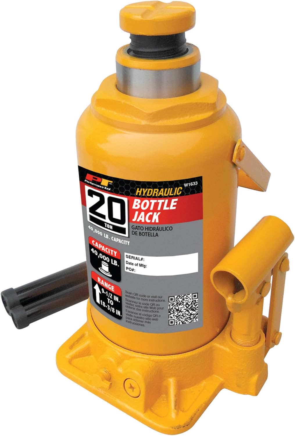 The Performance Tool Heavy Duty Bottle Jack is the perfect tool for tackling heavy-duty vehicle maintenance tasks with ease. Boasting a 12-ton capacity and load capacity of 24,000 lbs, this jack can handle even the toughest jobs. With a versatile lifting range of 6 11/16" to 13", it's suitable for lifting cars, trucks, and farm equipment. The adjustable top screw allows for easy height adjustment and provides additional support during the lifting process. For added convenience, the jack features a folding handle that makes it easy to store in tight spaces and is designed for comfortable operation. Safety is a top priority, and this jack delivers with a grooved steel lifting saddle and patented bypass device that ensures safe and reliable lifting. It also meets or exceeds ASME PALD-2009 standards for performance and safety. Whether you're working in an auto shop or on the farm, this jack is a must-have for safe and efficient vehicle maintenance.