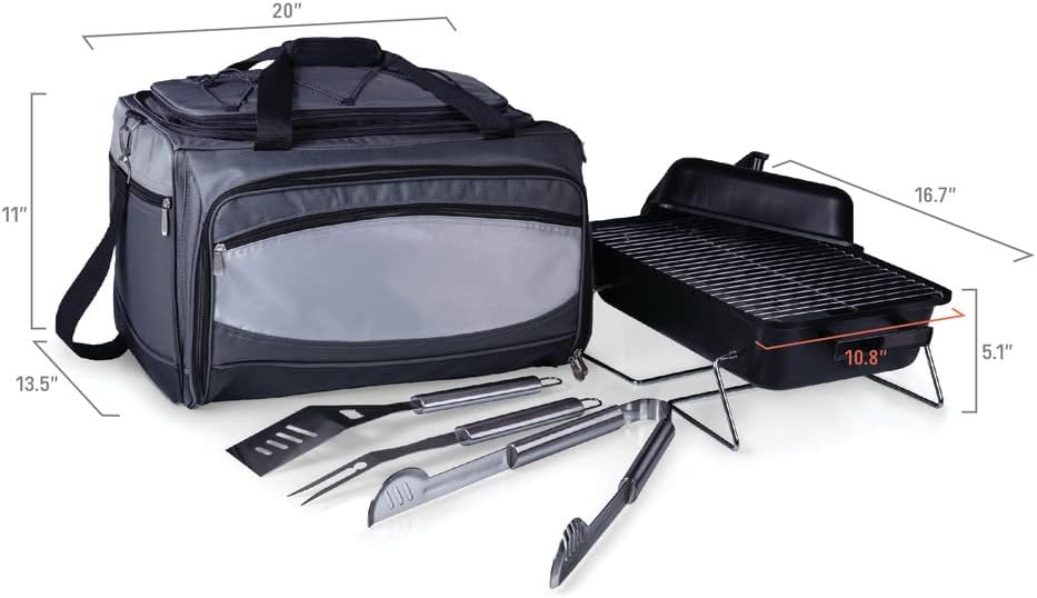 | Included Components | 1 Combination Storage Bag and Cooler Tote (20"x 13.5" x 11"),1 Portable Charcoal BBQ Grill with Lid (16.7"L X 10.8"W X 5.1"H),1 Drawstring Bag to Hold the Grill (17" x 11"),1 Large Spatula Featuring A Built-In Bottle Opener (16.5"),1 Pair Of Tongs (16.5"),1 BBQ Fork (16.5") |