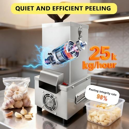 Introducing the 180W Commercial Electric Garlic Peeler Machine, a must-have for any professional kitchen. Crafted from durable stainless steel, this garlic clove peeling tool is designed for high efficiency, boasting an impressive capacity of 25 kg/h. Whether you run a restaurant, BBQ shop, canteen, or hotel kitchen, this machine significantly reduces preparation time, allowing you to serve your customers faster and more efficiently. With a peeling rate of 98%, our garlic peeler ensures that you get the most out of your garlic cloves while minimizing waste. The machine’s compact dimensions (22*21*51cm) make it easy to fit into any kitchen setup, while its lightweight design (8.5kg net weight) allows for easy mobility and storage. To use, simply crush and dry your garlic cloves before placing them in the peeler. Please note that this machine is specifically designed for peeling garlic and is not suitable for red garlic, wet garlic, or fresh garlic. Minor damage to some cloves is expected, but the convenience and time saved are well worth it. Included in your purchase is the garlic peeler and an instructional manual, ensuring you have everything you need to get started. Elevate your kitchen’s efficiency with the 180W Commercial Electric Garlic Peeler Machine, a reliable solution for all your garlic peeling needs. Enjoy the benefits of a streamlined workflow and consistently high-quality results, making this machine an invaluable addition to any culinary environment.