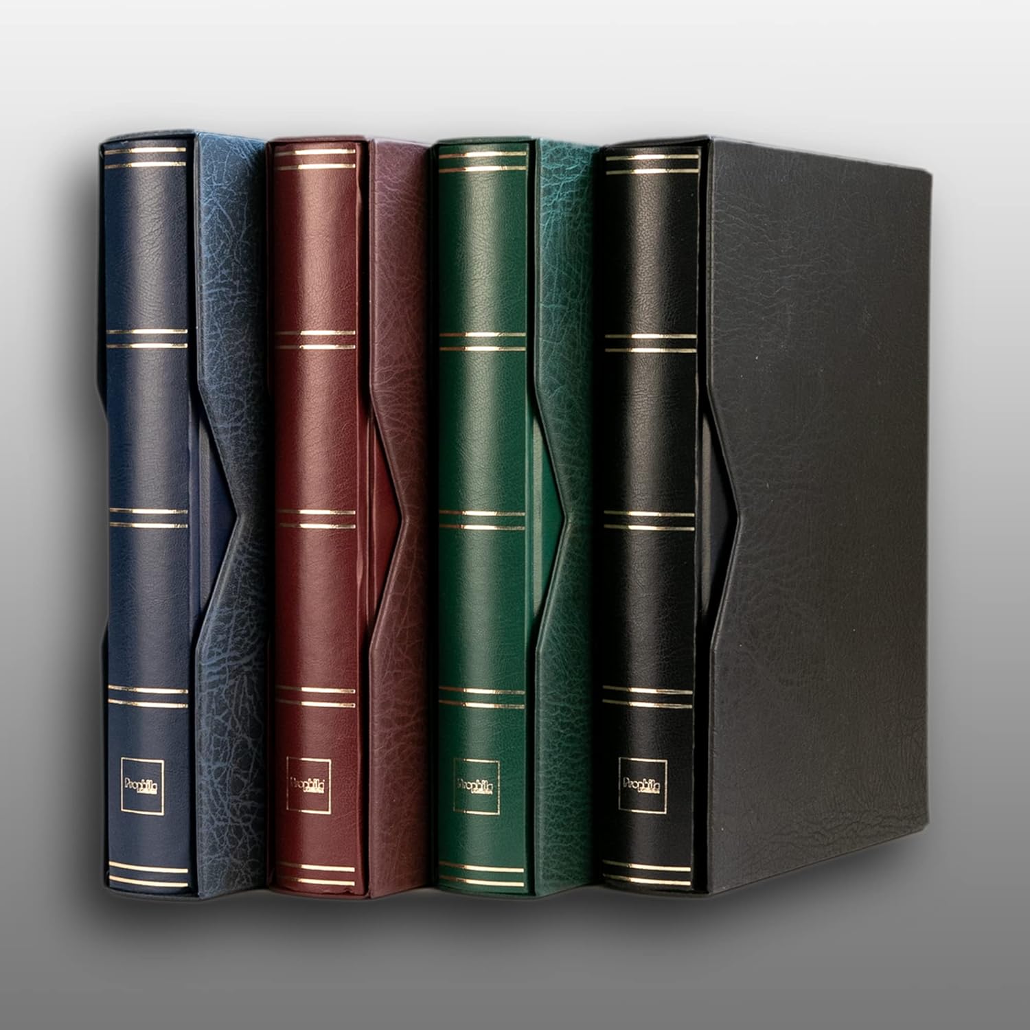 Luxury stamp insert book with cassette, padded cover, 60 white pages / divided (for simultaneous collection of mint never hinged and stamped), 9 glassine insert strips per page, 2 glassine interleaves per sheet, all pages with sturdy double joint binding, decorative gold backing, branded product from Leuchtturm. Size: 23 x 30.5 cm. Note: You are buying a valuable product from Prophila. This album is made by Leuchtturm for Prophila. Includes plastic case with recessed grip for easy operation. High quality design with leather look and grain. Shape adapted to the round backs of the albums to be stored. In harmonious colour coordination with the corresponding albums. Protects against dust and harmful light. Stability of albums on the shelf. Transport protection - prevents marks from falling out. Cassette dimensions: height: 32 cm, width: 24 cm, depth: 5.5 cm. Inner cassette format: height: 31 cm, width: 23 cm, depth: 4.8 cm