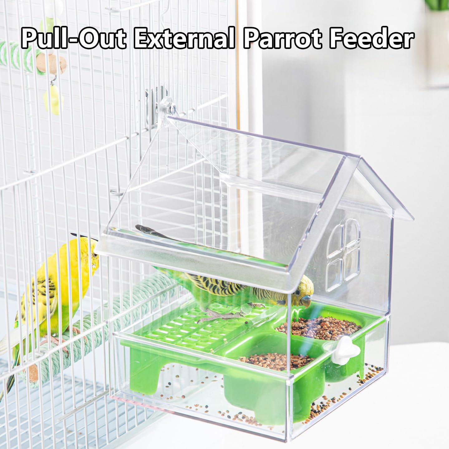 -------------------------------Welcome to our shop-----------------------------Pull-Out External Parrot Feeder, Long-Lasting Outdoor Use, 18.5 X 14.5 X 14 Cm, Bird Feeder House, Decorative Transparent Bird Bath Tub Easy to Fill, Clean, for Finch and Hummingbird, PatioWhat's so special about Pull-Out External Parrot Feeder?Feature:3-in-1 feeder & bath lets birds eat, drink, playTransparent design adds charm to garden décor7.28×5.91×5.51" fits parakeets, finches, lovebirdsDurable ABS build, leak-resistant & chew-safePull-out tray allows quick cleaning & easy careFits most cages with 2.2mm wire diameter setupGreat gift for bird lovers & outdoor enthusiastsSpecifications:Name: Pull-Out External Parrot FeederMaterial: AS (Acrylonitrile Styrene)Size: 14 × 14.6 × 18 cmInstallation: Easily mounts using screws; fits most standard cagesCare Tips: Regular cleaning recommended to avoid buildup of food or water residuePackage Contents:1/2pcs * External Parrot Feeder1/2pcs * Parrot RingNote:Due to manual measurements, please allow slight measurement deviations.Due to the different display and lighting effects, the actual color of the item may be slightly different from the color displayed on the picture.