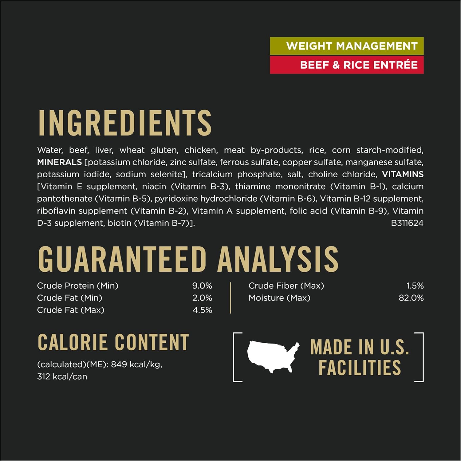 Help your dog maintain a healthy weight with Purina Pro Plan Weight Management Beef and Rice Entree in Gravy wet adult dog food. Made with real beef, for a taste dogs love, this high protein dog food helps your pal maintain muscle mass during weight loss. Every serving of this Purina Pro Plan Weight Management dog food is ideal for overweight or less active dogs with 25 percent less fat than Pro Plan Complete Essentials Classic Chicken and Rice Entree adult dog food. Plus, the weight management dog food formula helps support a healthy immune system and nourishes his healthy skin and coat. And to ensure this wet food for dogs gives your dog only what he needs and nothing he doesn’t it’s made with no artificial colors, flavors or preservatives. Help your dog achieve a healthy weight by filling his bowl with Purina Pro Plan Weight Management Beef and Rice Entree in Gravy wet adult dog food.