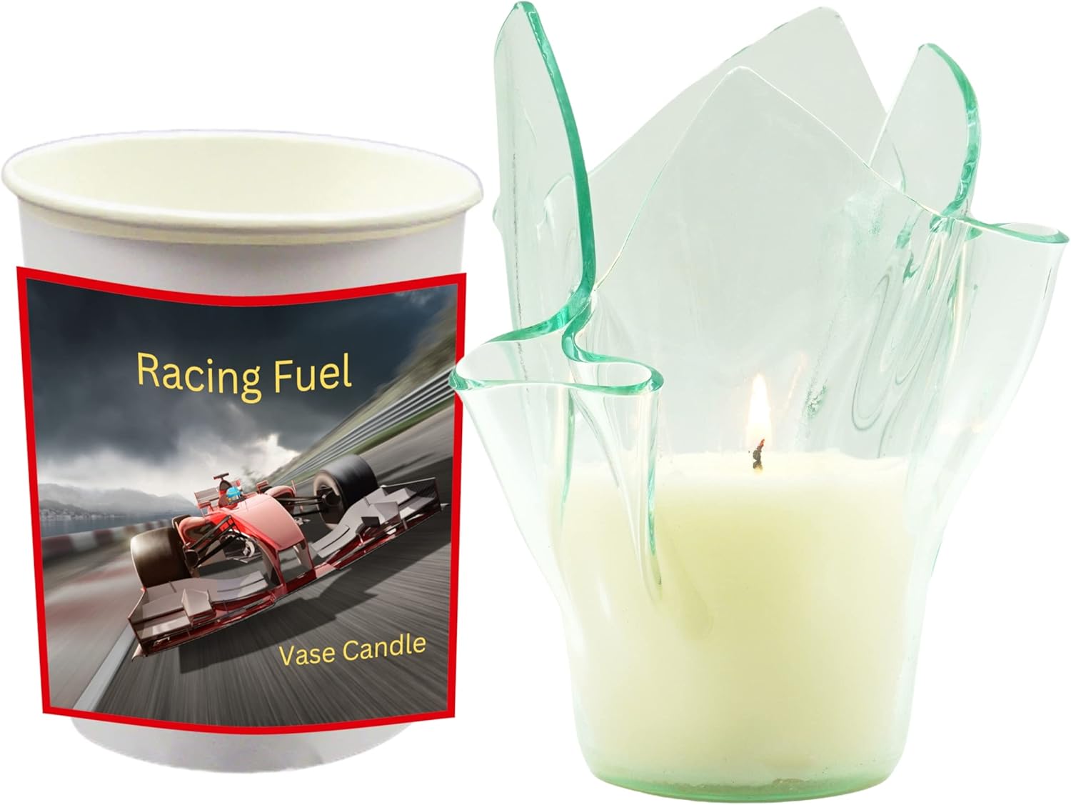 Racing Fuel - Notes of burnt rubber, motor oil, and high performance gasoline.Clear Vase Dish Set 1 refillable Clear Glass Satin Vase and 1 Clear Glass Satin Dish - each one unique. Our vases average between 5" to 7" tall and can be as wide as 5" at the top and 2" at the bottom. The dishes are between 8" and 9" across and no more than 4" tall. Our Clear Vases and Dishes are made from regular window glass with a high silica content. Very elegant and tough - great as a daily burner. 2 Candle Refills with a 50 hour Burn Time each | Total of 100 hour burn time. Each Vase Candle Refill | 6 oz | 50 Hour Burn Time | 2.5" width x 3.8" height. The Candles and Melts are fresh and poured to order with fragrance all the way through the creamy, soft, uncolored paraffin/soy blend wax for excellent throw and clean-up. We use a Self-Trimming, Paper Core Wick, premium fragrances, and uncolored wax so that nothing gets in the way of a clean burn. No Coloring Added - the Wax is a Natural Creamy White Color.