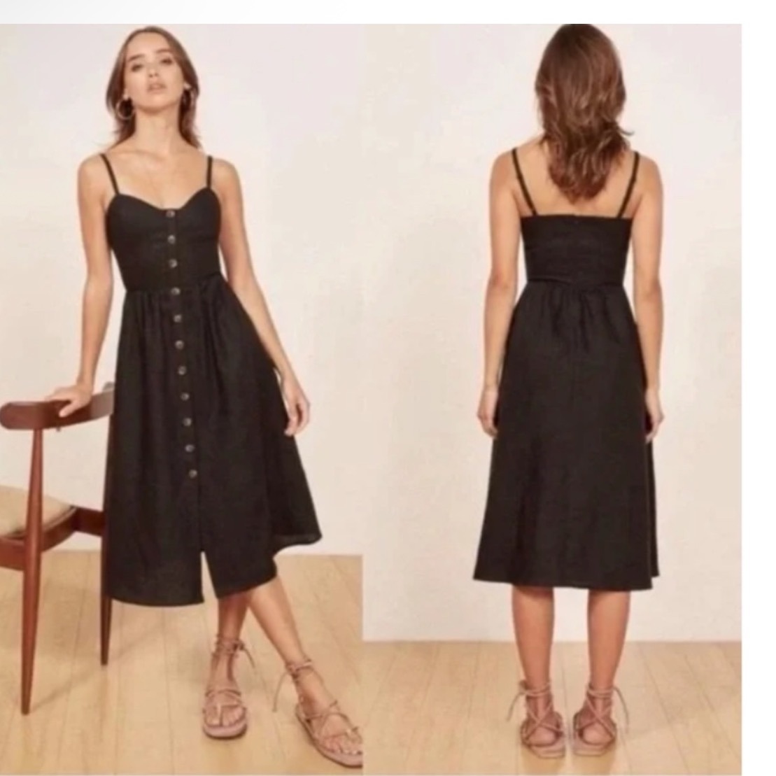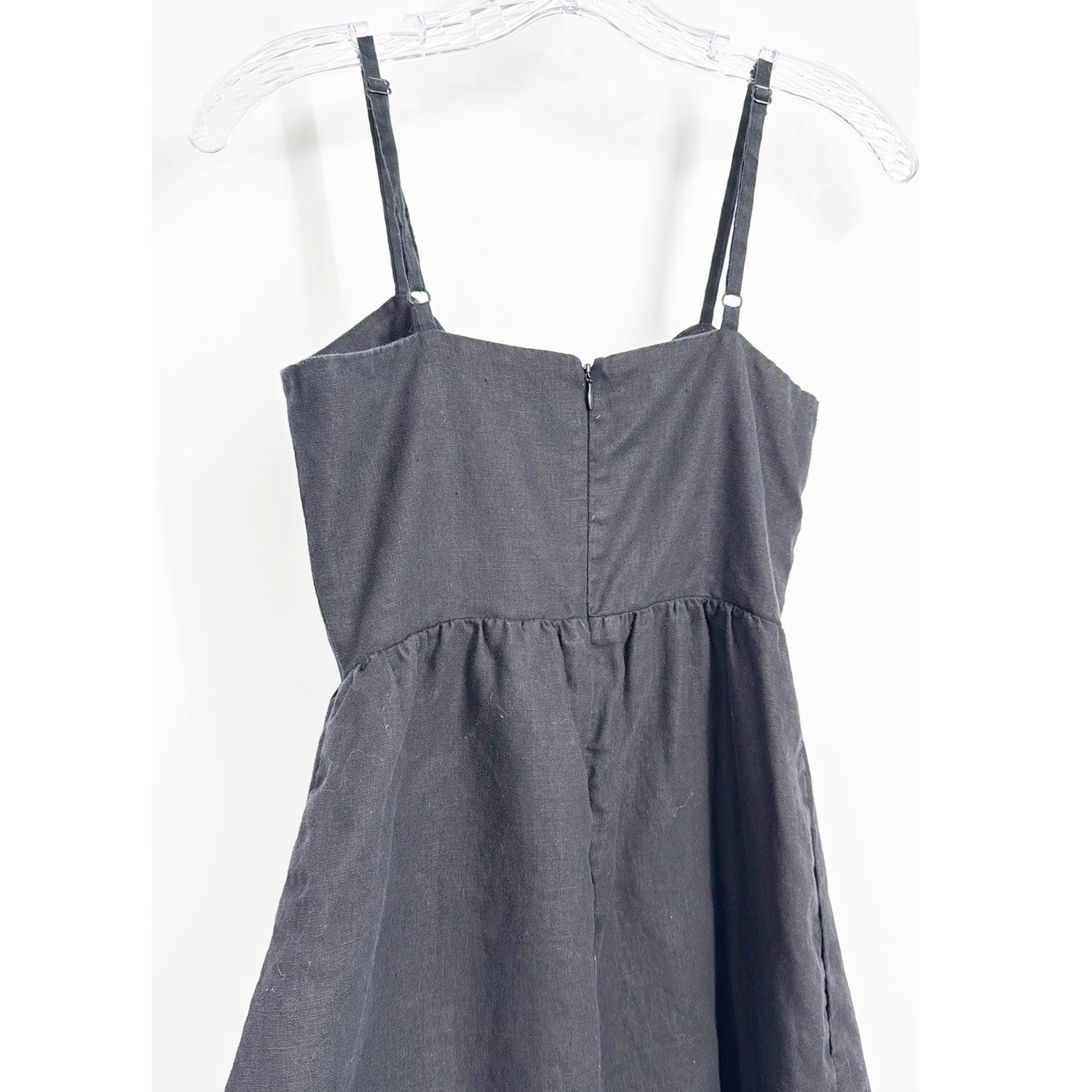 Great preowned condition. Missing content tag but other listings show it as linen. Capture a carefree silhouette with this charming button-front dress. Effortlessly chic and endlessly versatile, the midi-length skirt dances just below the knee, creating a flattering and feminine shape. Adjustable straps and a fitted bodice ensure a comfortable and customizable fit, while the full button front closure adds a touch of vintage-inspired charm. Boasting subtle side pockets, this garment blends practicality with grace. Wear it on a sunny picnic, to a breezy brunch, or for a casual stroll through town.