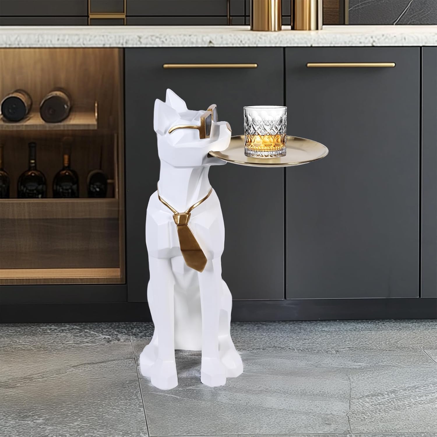【Movable Tray Design】The dog accent table features a unique, detachable tray with a curled edge. This design allows for easy handling and repositioning of the tray without risk of injury. Use it to store essentials like mobile phones, remote controls, keys, and even candy boxes in a functional and stylish way. 【Perfect Size for a Tissue Box】The back of the dog end table includes a thoughtful design with a compartment for a tissue box (fits tissue box size: 5.1"L x 3.1"W x 2.4"H). This added feature makes this piece even more practical, enhancing its functionality in any living space. 【Unique Home Decor】The dog statue with tray serves as a striking decor piece. This dog butler statue with tray brings warmth and creativity to your space, making it an exceptional work of art. It fits perfectly in various settings such as your living room, office, dining room, entryway, or even your bathroom, adding a touch of fun and flair to your home. 【Geometric Dog Sculpture】Designed with a modern, geometric dog sculpture style, this piece serves as both furniture and an artistic element. It’s the ideal balance between a functional dog side table and a statement decor item, perfect for those looking for funky furniture and decor. 【Multi-functional and Creative】This versatile dog sculpture with tray can function as a unique end table or an eye-catching floor sculpture in any room. It's designed to not only hold small items but also double as a charming and whimsical piece of decor. Whether in the living room, office, or hallway, it brings personality and function to any space. 【Artistic Furniture Piece】If you enjoy contemporary floor statues for home decor, this tall floor sculpture is a must-have. Combining form and function, it provides an artistic vibe while offering practicality. Its life-size dog statue design makes it a conversation starter and a stand-out piece in any home.
