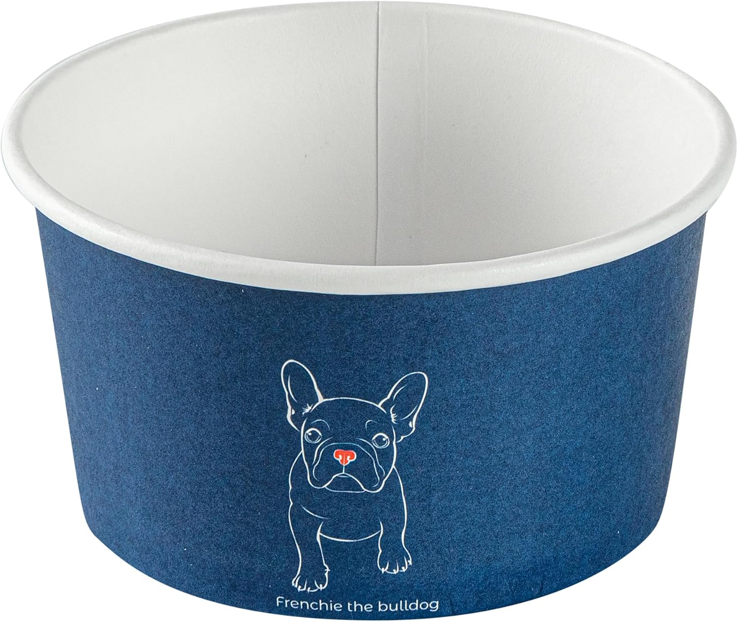Present your treats in style with our Coppetta 8-ounce Round Frenchie Paper To Go Cups. Made from premium paper, these takeaway dessert cups are suitable for serving hot and cold food items at your foodservice establishments. With a no-grease PE lining, these round ice cream cups keep oil and grease unsightly splotches for a neat presentation. The rolled rim of these frozen yogurt paper cups forms a snug seal with coordinating lids (ASIN: B01MTYRLG0) for a convenient take out solution. With an adorable Frenchie print on a blue finish, these premium paper frozen dessert cups create a stylish look for your food presentation. These cups for ice cream are freezable, making them ideal for storing leftover frozen treats. Designed to be sustainable and disposable, these dessert cups provide an ecologically-conscious cleaning experience. Measuring 3.7 inches in diameter by 2.2 inches in height, these to go cups can hold up to 8 ounces. Sold in a 200 count box. Lids are available and sold separately.