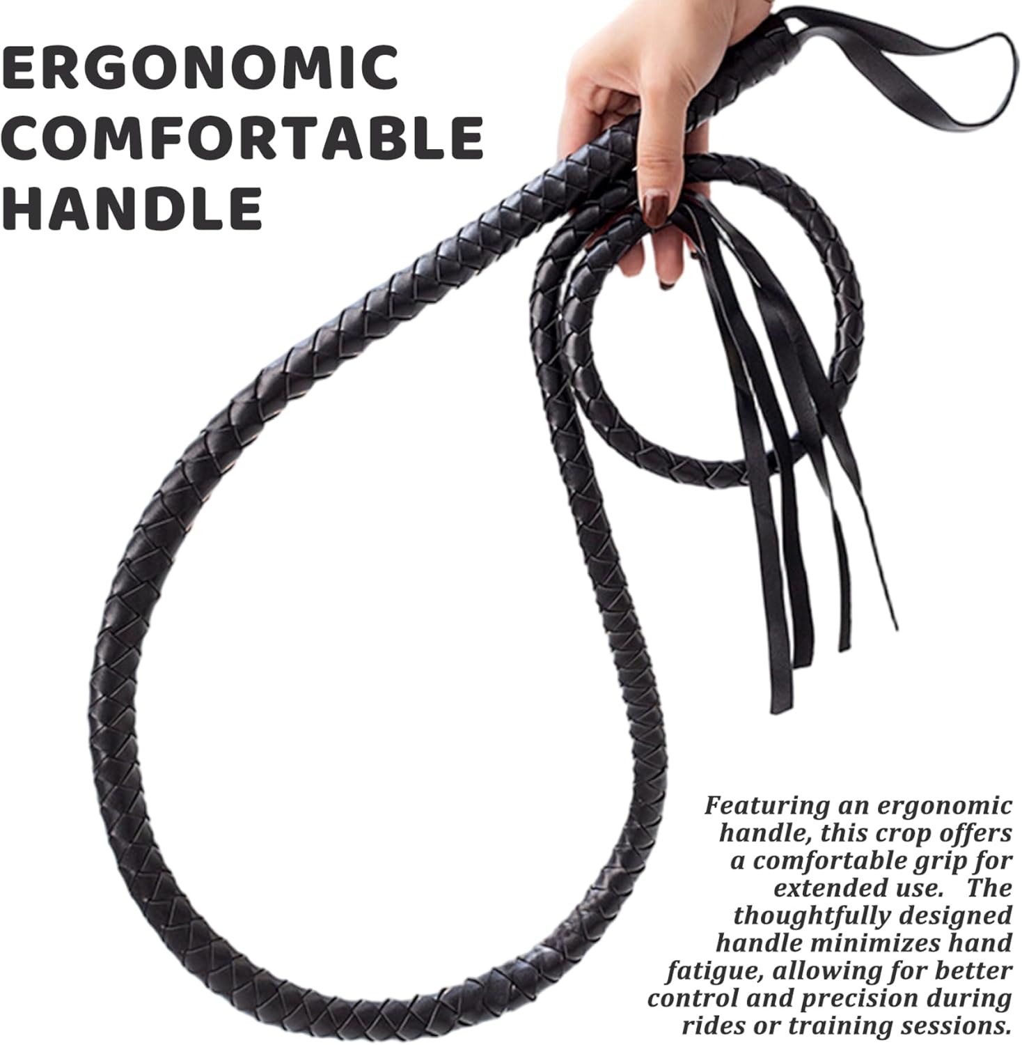 Description: Enhance your riding experience with this 75-inch leather horse whip, crafted for performance, comfort, and control. Made with leather, it offers the perfect combination of flexibility and firmness to help communicate with your horse more effectively. The whip's lightweight build makes it easy to handle, while the comfortable non-slip grip ensures a secure hold through long rides or training sessions. Ideal for both novice and seasoned riders, this horse crop is suitable for various equestrian disciplines, including trail rides, schooling, and arena training. Its sleek black finish and streamlined design add a touch of professionalism and style to your riding gear. The whip is also compact enough to be packed in a gear bag, making it a reliable companion wherever your equestrian pursuits take you. Designed with practicality and performance in mind, this riding crop supports better control, clearer signals, and a more effective riding routine. Features:. Riding Crop. -Color: Black. -Material: Leather. -Size: about 190cm/74.80inch. Note:Manual measurement, please allow slight errors on size.The colors may exist slight difference due to different screens. Package Including 1 x Riding Crop.