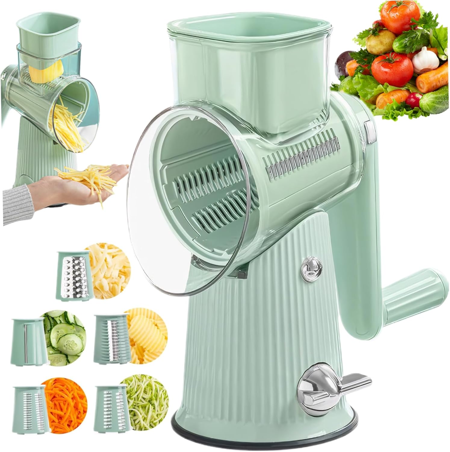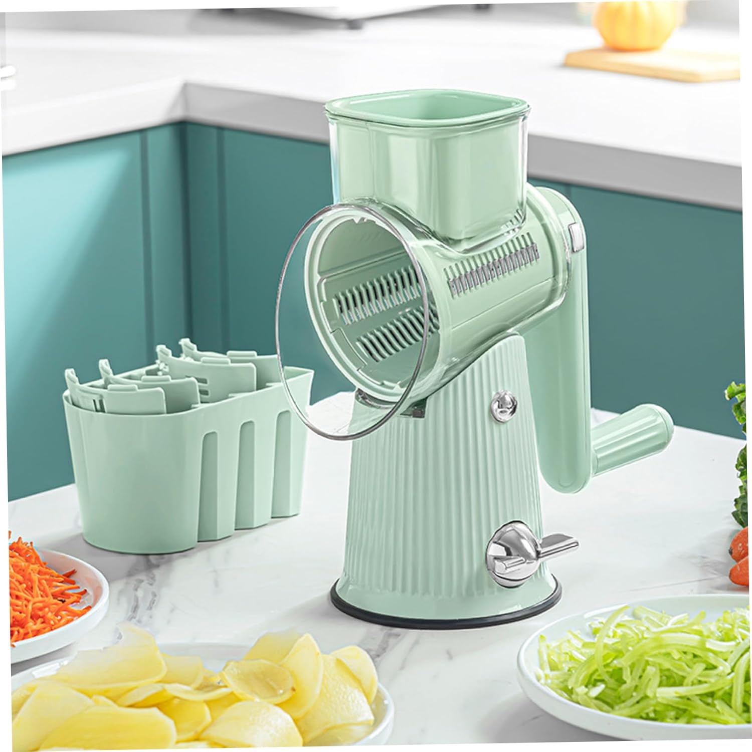 Description: Introducing our Rotary Cheese Grater, a versatile kitchen tool that makes grating cheese and other ingredients effortless. With its hand crank design, you can easily grate cheese without straining your hands or wrists. The grater comes with 5 different blades, allowing you to choose the perfect grating option for your recipes. From fine to coarse, you can achieve the desired texture with ease. The sucker base securely attaches to your countertop or any flat surface, providing stability during grating and preventing slips or accidents. Not limited to cheese, this grater can also be used for vegetables, chocolate, and more, adding convenience to your kitchen tasks. Cleaning is a breeze as well, with the parts easily disassembling for rinsing under running water or placing in the dishwasher. Elevate your cooking experience with our Rotary Cheese Grater, a versatile and efficient tool for any kitchen. Features:. Rotary Cheese Grater. -Color: Green. -Material: PP+ABS+PET. -Size: Packing Size: about 23.5x14x28.5 cm/9.25x5.51x11.22 inch. Note: Manual measurement, please allow slight errors in size. The colors may exist slight difference due to different screens. Package Including 1 x Rotary Cheese Grater