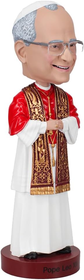 Honor the historic leadership of Pope Leo XIV, the first pope born in the United States, with this beautifully crafted collectible. This premium quality bobblehead from Royal Bobbles celebrates Pope Leo XIV’s election in 2025 and his lifelong dedication to faith, service, and the Catholic Church. Hand-painted with remarkable detail, this intricate Pope Leo XIV bobblehead is made from high-quality resin and designed to be a cherished keepsake for collectors and history enthusiasts alike. Standing approximately 8” tall, it captures the dignity of the Holy Father and makes a meaningful gift or display piece for homes, offices, or parishes.
