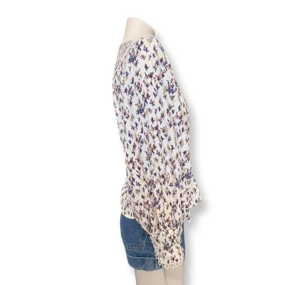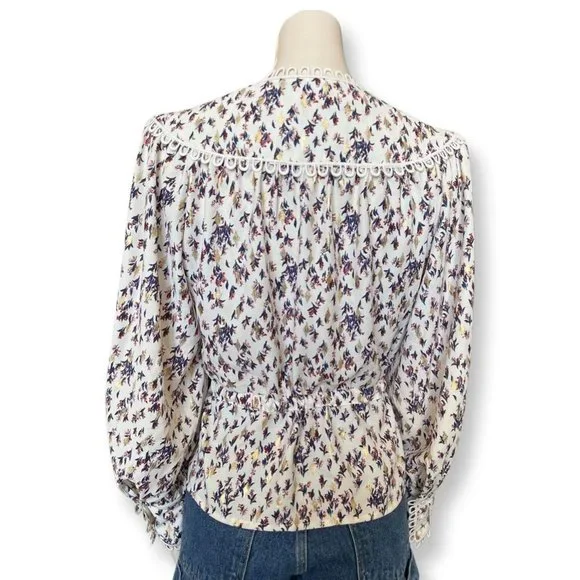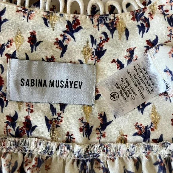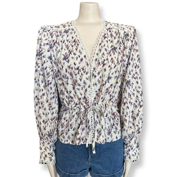 Sabina Musayev Sage TopNew No TagsThe Sabina Musayev Sage Top features a botanical print on a woven polyester. Loop details at V-neckline, shoulders, back yoke, and bishop sleeve cuffs. Pleated detail at back and tie waist create a unique silhouette.FRONT BUTTON CLOSURESIZE MPIT TO PIT 19''LENGTH FROM SGOULDER TO HEM 20''SLEEVE LENGTH 23''ADJUSTABLE WAIST FITS THE MOSTPlease note that all measurements were taken while garment waslaying flat and unstretched#MASAYEV #SABINA #SAGE #BOHO #BISHOPTPD712