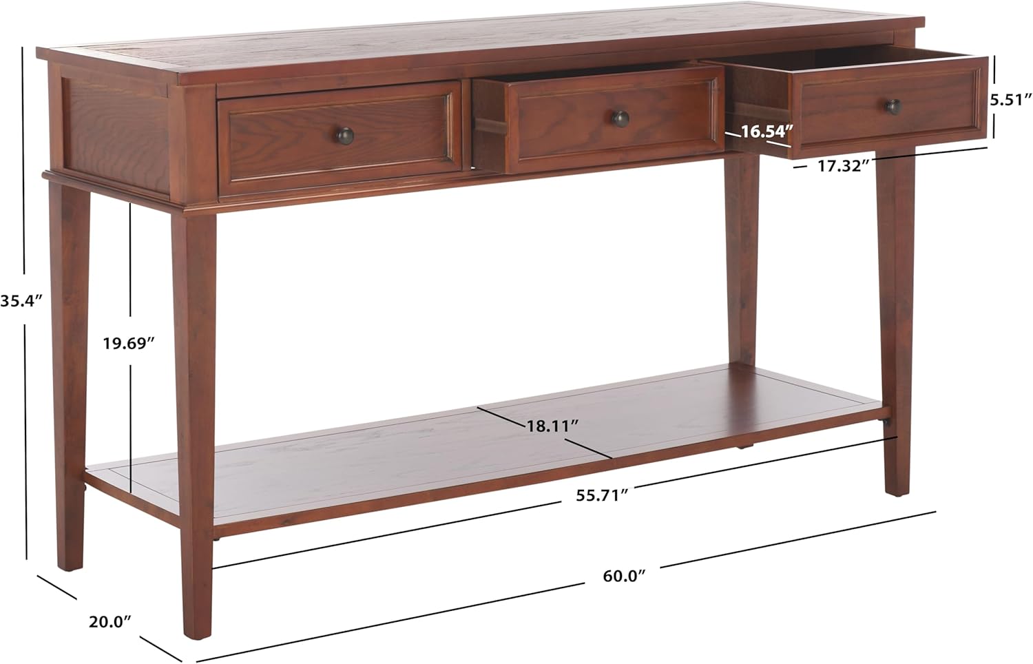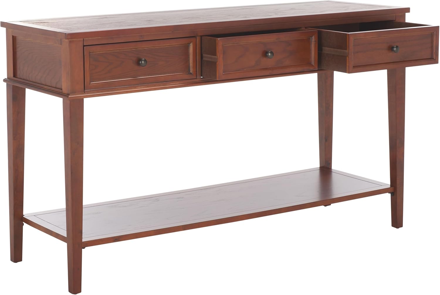 Simple lines and purity of function lend a timeless quality to the Shaker-inspired Manelin console with tapered legs, three drawers and lower shelf. Crafted of pine in a sepia finish, this console is at home in country, rustic or transitional settings.
