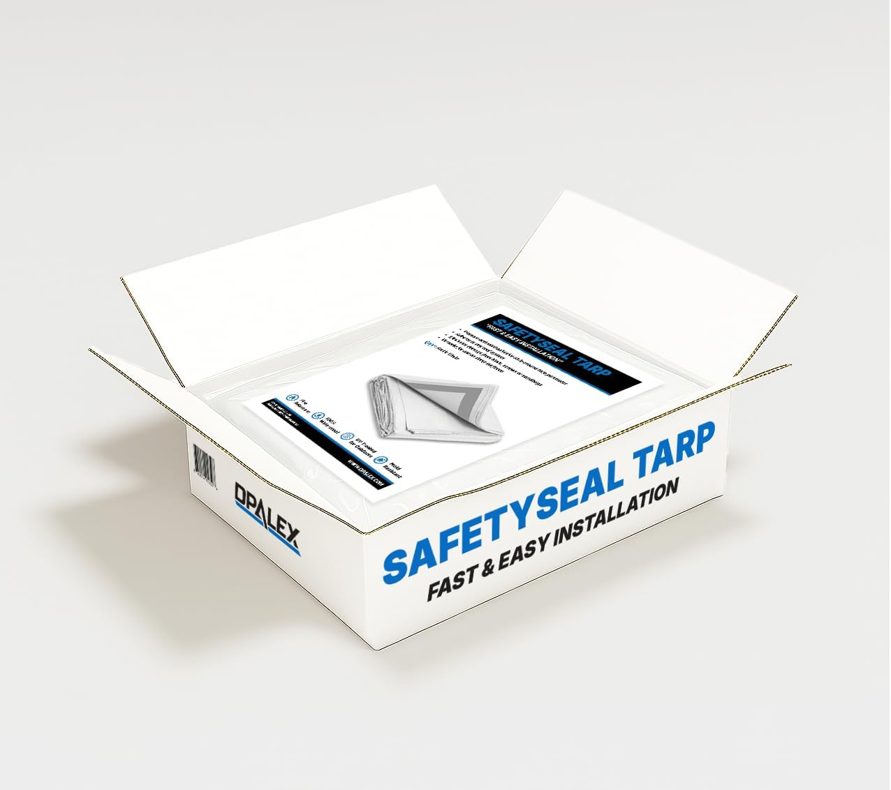 The DPALEX SafetySeal Adhesive Tarp - 12 Series revolutionizes temporary roof protection with its innovative no-tool installation system. Featuring SafetySeal micro-grip adhesive technology, this tarp uses pressure-activated polymers that conform to rough and textured surfaces, creating a continuous, high-tack perimeter seal in minutes. Constructed from 8-mil commercial-grade polyethylene with 1000 Denier fabric, this all-weather barrier delivers 100% waterproof protection. The tarp is NFPA 701 fire retardant certified and UV protected with 80% resistance at 200 hours, providing up to 1 year of outdoor service life. Its reinforced, rip and tear-resistant construction with strengthened edges ensures durability in harsh conditions. The multi-surface compatible adhesive bonds securely to metal, shingles, tile, slate, clay, concrete, and wood substrates. Available in three sizes (6' x 8', 10' x 12', and 18' x 20'), this white tarp offers a fast, solo-install solution for emergency roof repairs and temporary weather defense without requiring nails, ropes, or additional fastening tools.