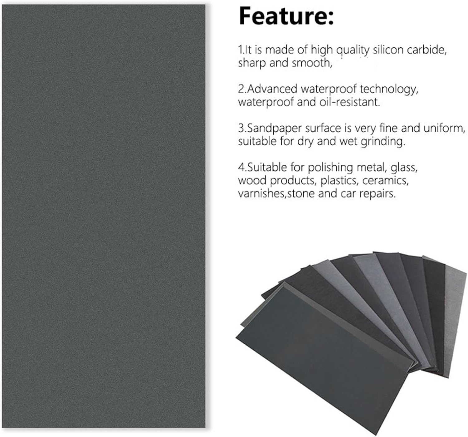 Types: Wet Dry SandpaperLong: 9 InchWidth: 3.6 InchGrits: 80/120/150/180/240/320/400/600/800/1000/1200/1500/2000/2500/3000/5000Application:It is great for metal, wood, glass, ceramics, stone and other surface. It can be easily cut and folded to fit any hand tool or work piece crevice.Package Including:4pcs Wet Dry Sandpaper Set
