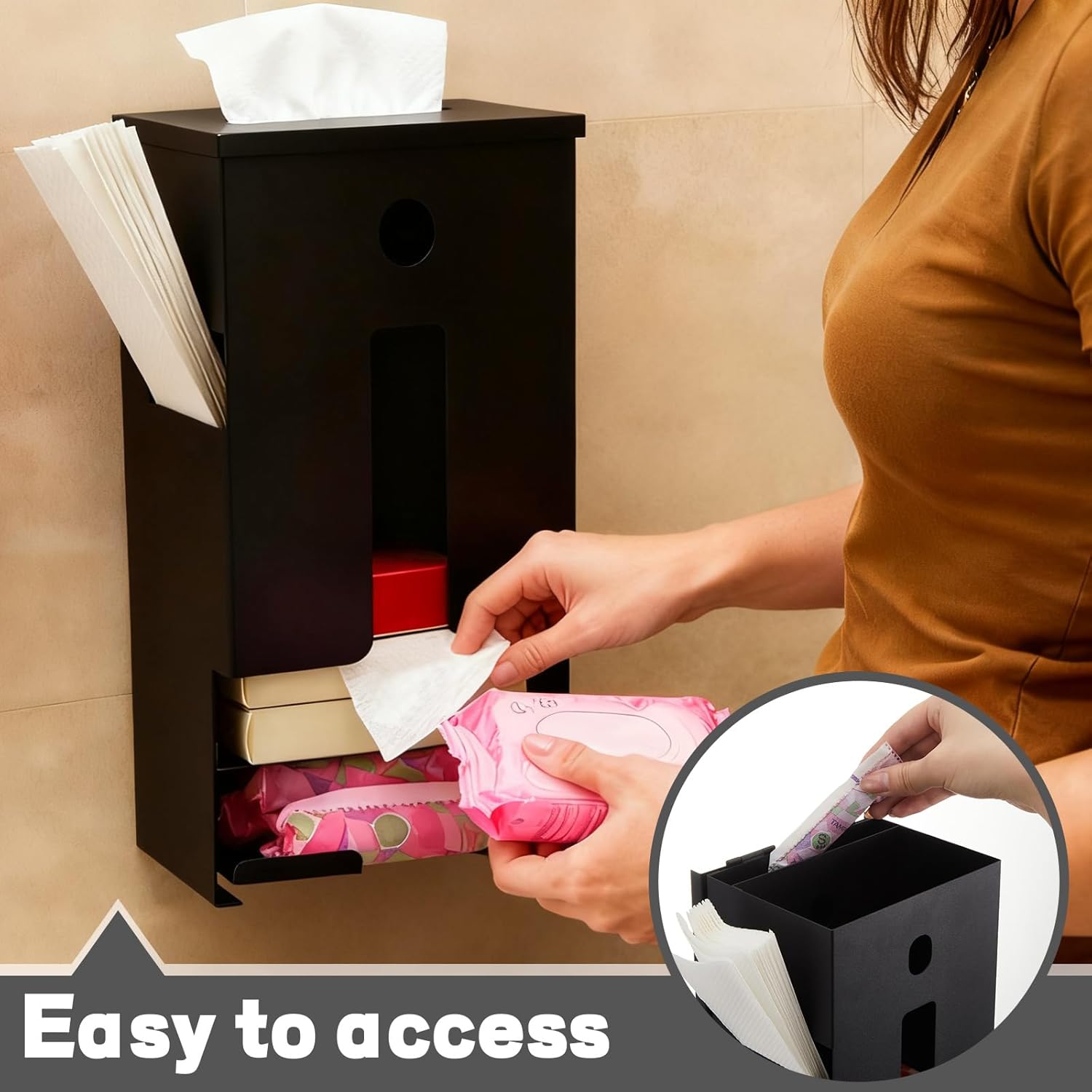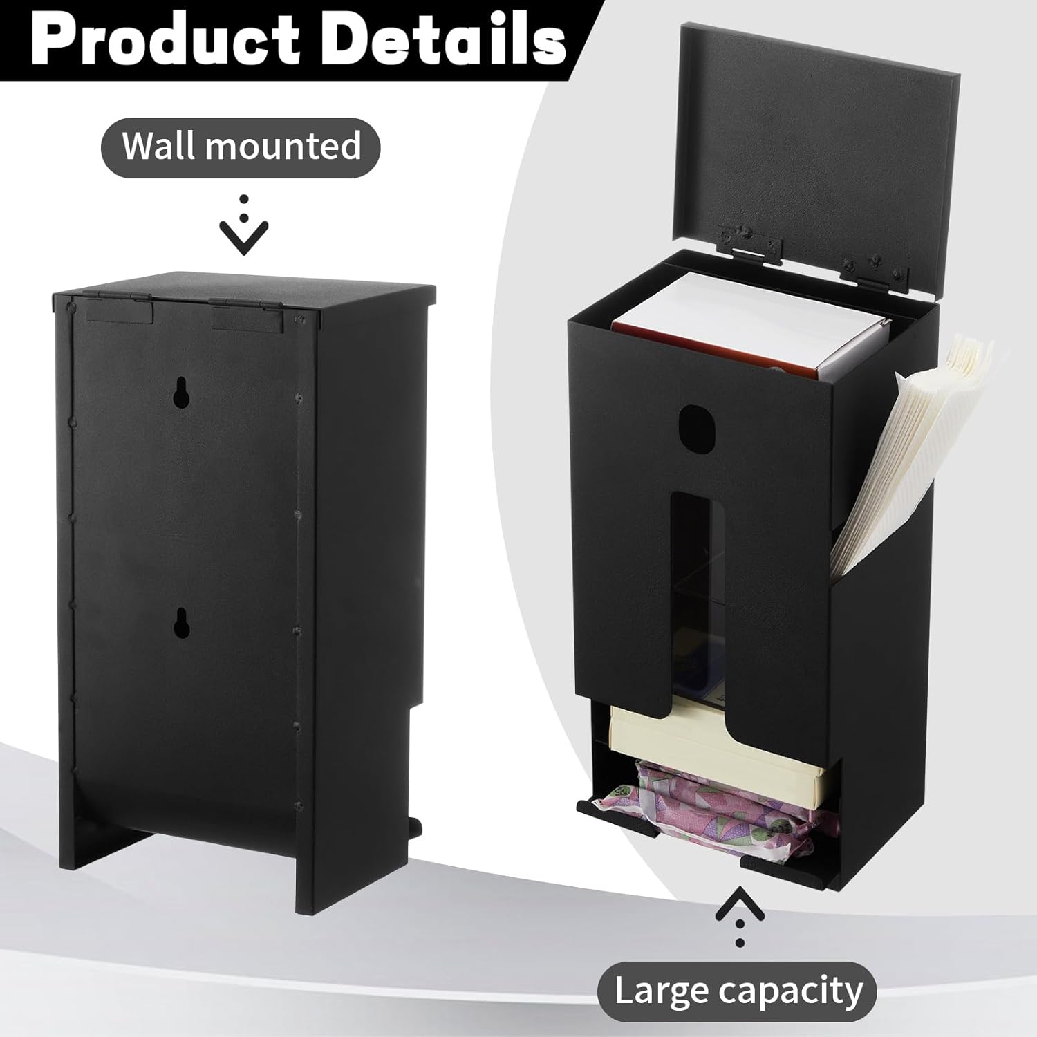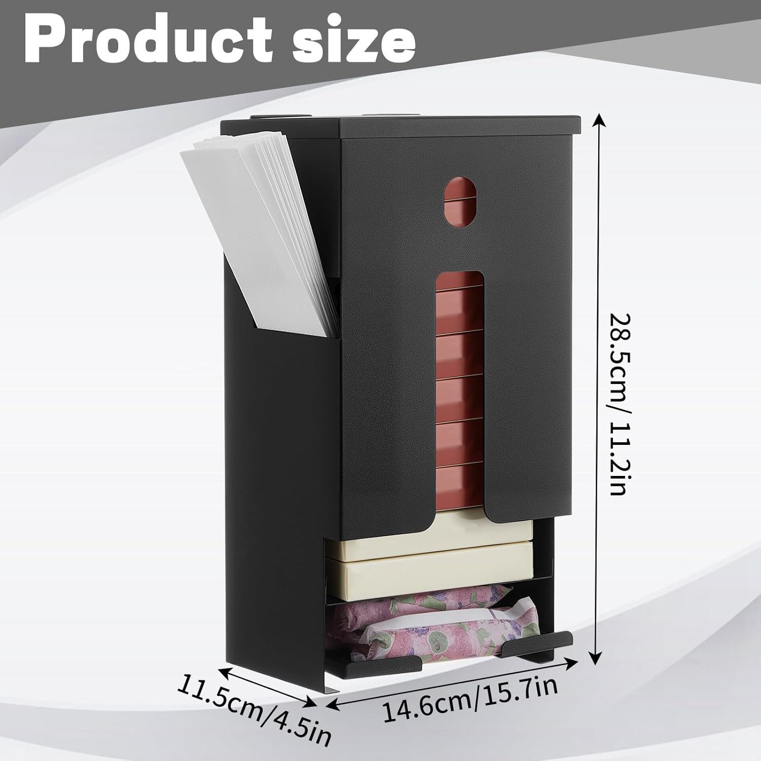 Features: Practical Appearance: The napkin and tampon dispenser features a black finish that blends seamlessly with most restroom interiors. Its neutral color and concise design make it both functional and visually unobtrusive. This aesthetic quality ensures the dispenser complements various decor styles while serving its practical purpose. Optimized Dimensions for Efficiency: With dimensions of 28.5 cm in height, 14.6 cm in width, and 11.5 cm in depth, this sanitary pad dispenser is engineered to maximize storage while minimizing space usage. Its compact size allows it to fit comfortably in restricted areas, such as restroom stalls or countertops, without compromising on capacity or accessibility. Material: iron Color: black Size: 28.5 x 14.6 x 11.5 cm/ 11.22 x 5.75 x 4.53 inches Package includes: 1pc x napkin and tampon dispenser Notes: Manual measurement, please allow slight errors on size. The color may exist a slight difference due to different screen displays