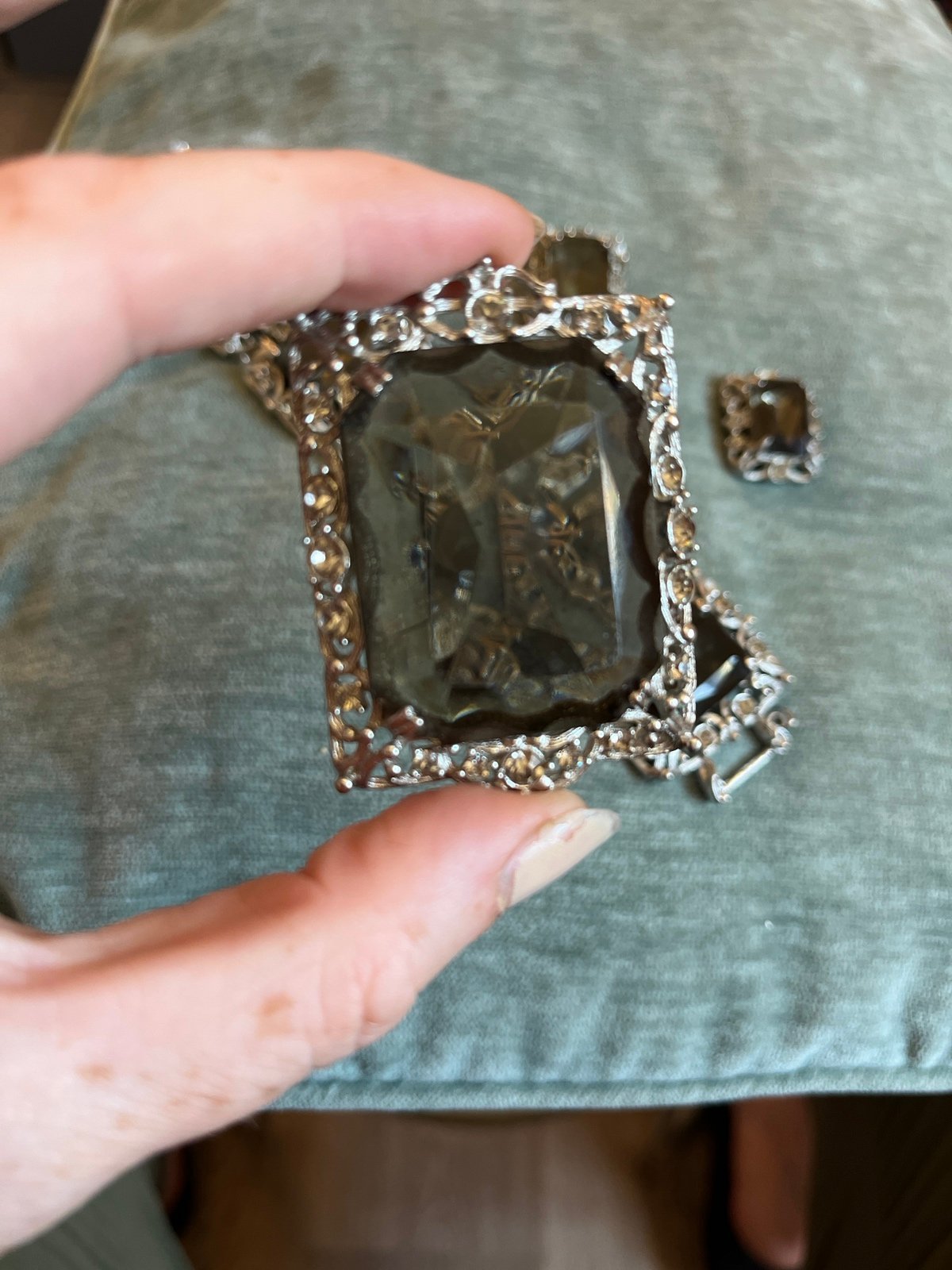 Larges smoky gray faceted glass set on ornate silver tone frame accented with smoky gray rhinestones.
