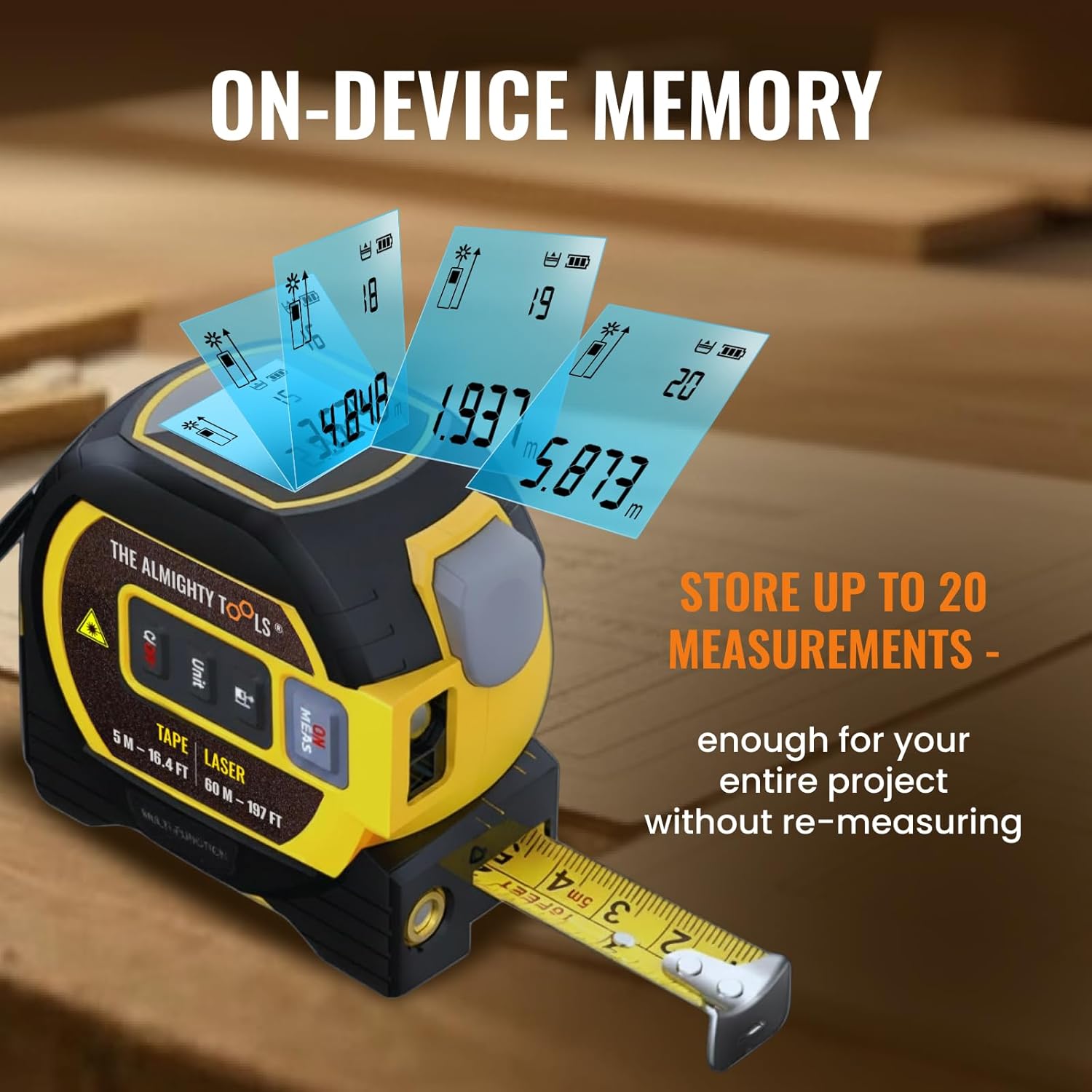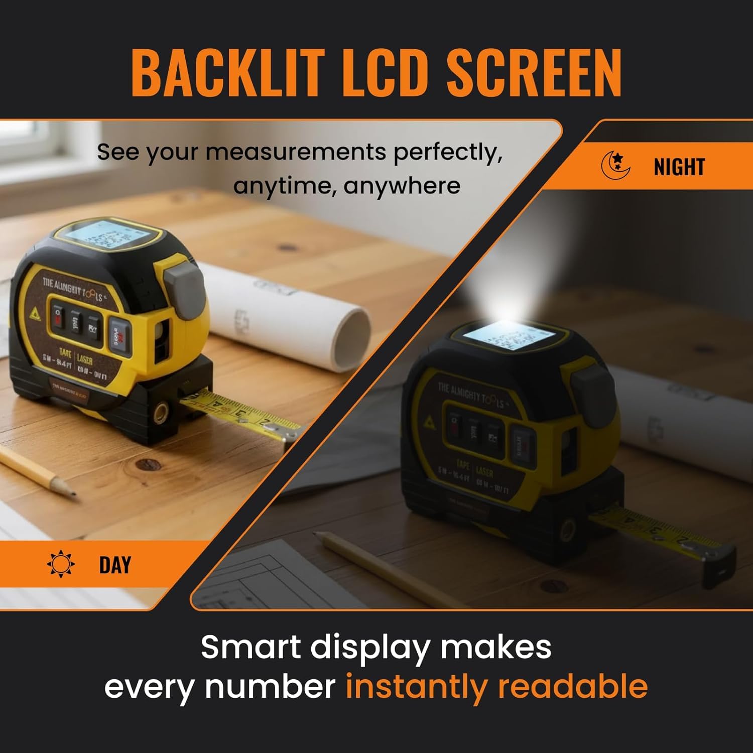 The Almighty Ruler Laser Tape Measure is a dual-mode measuring tool designed to make distance work fast, simple and reliable. It combines a laser distance measurer with a classic tape, giving you two dependable measurement methods in one smart device. Use the laser for long-range measurement across rooms, walls or furniture, and use the tape for close detail work with fractions, centimeters and millimeters. Both ft and metric systems are supported for accurate and flexible measuring. The magnetic base keeps the tool steady on metal surfaces, allowing hands-free measuring during construction, installation or electrical work. This feature is especially useful for engineers, electricians and professionals who need stability while reading values. The automatic lock design secures the tape in place without pressing a button, making operation simple and efficient. The tool is compact, heavy-duty and left-handed friendly, fitting comfortably in a pocket, belt or toolbox for everyday use. The clear digital display provides instant readout, while the infrared laser ensures visibility even in darker areas such as basements, garages or job sites. The durable housing protects the electronic components during daily transport and work. The package includes the laser tape measure and a special screwdriver for opening the battery compartment. Batteries are required for operation and are not included in the box. Whether for home projects or professional use, The Almighty Ruler Laser Tape Measure delivers accuracy, convenience and reliability. Strong, magnetic, compact and precise, it is a practical solution for fast and efficient measuring without complicated setup. 1. class 2 2. Laser power less than 1 mW 3. laser wavelength: 630-670nm