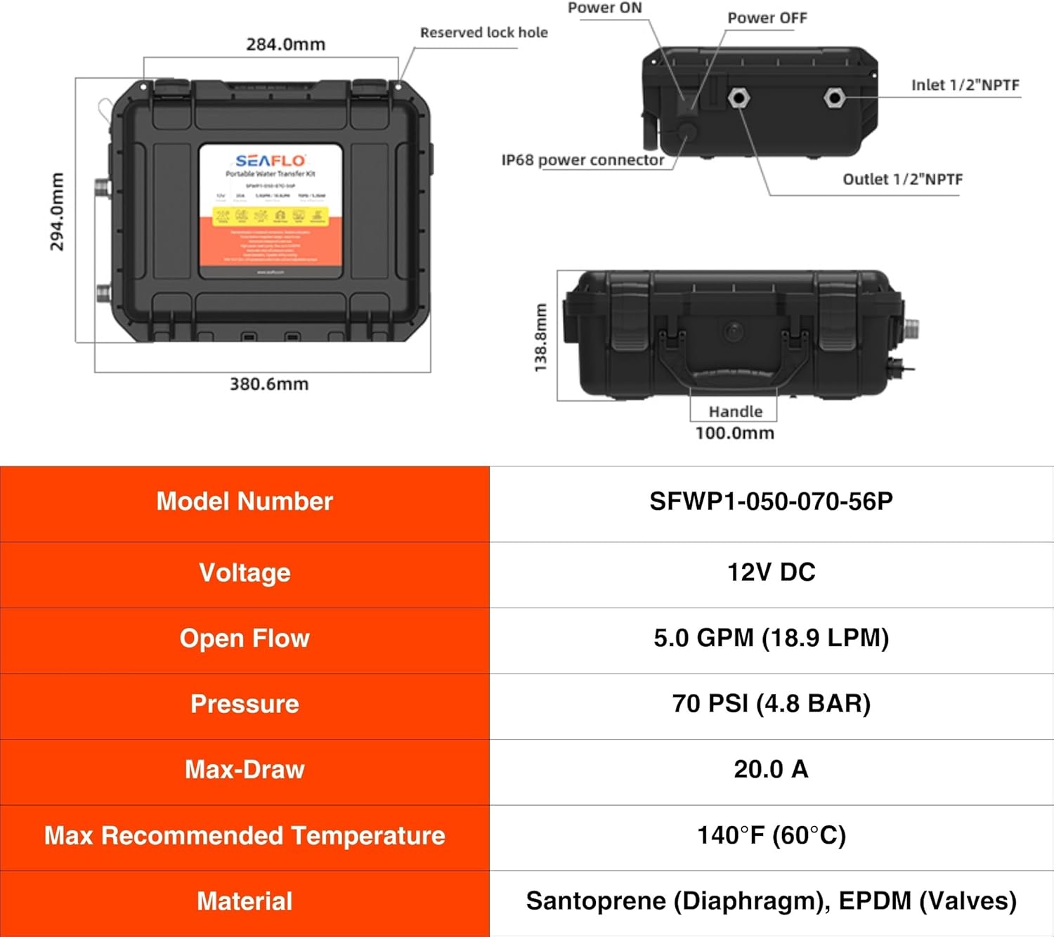 • [ SPECIFICATIONS ]: Model Number: SFWP1-050-070-56P Voltage: 12V DC Open Flow: 5.0 GPM (18.9 LPM) Shut-off Pressure: 70 PSI (4.8 BAR) Priming Capability: Self-priming up to 6 feet (1.8 m) suction lift Max Draw: 20.0 A Inlet/Outlet Size: 1/2"-14 MNPT Material: EPDM valves / Santoprene diaphragm