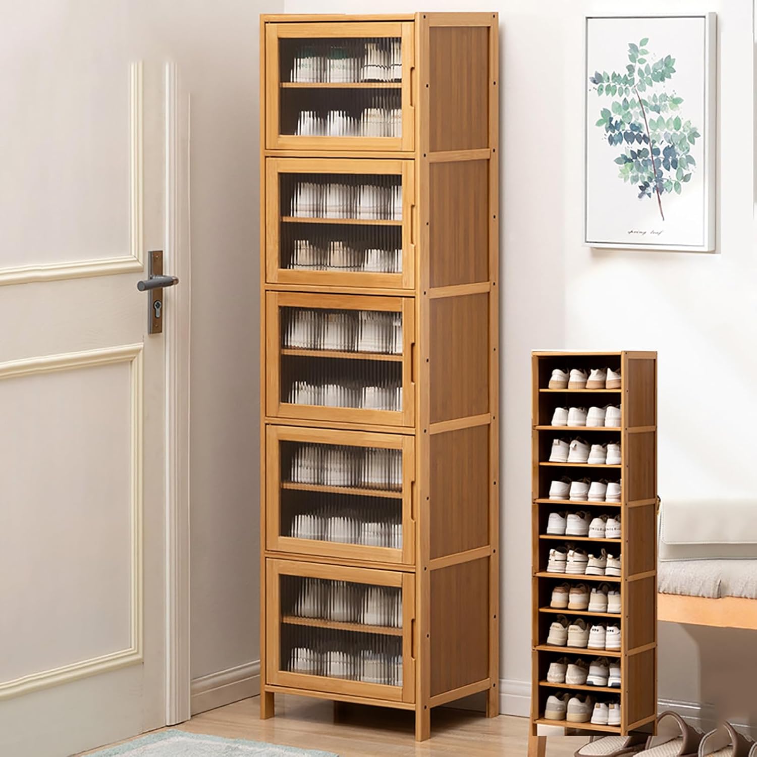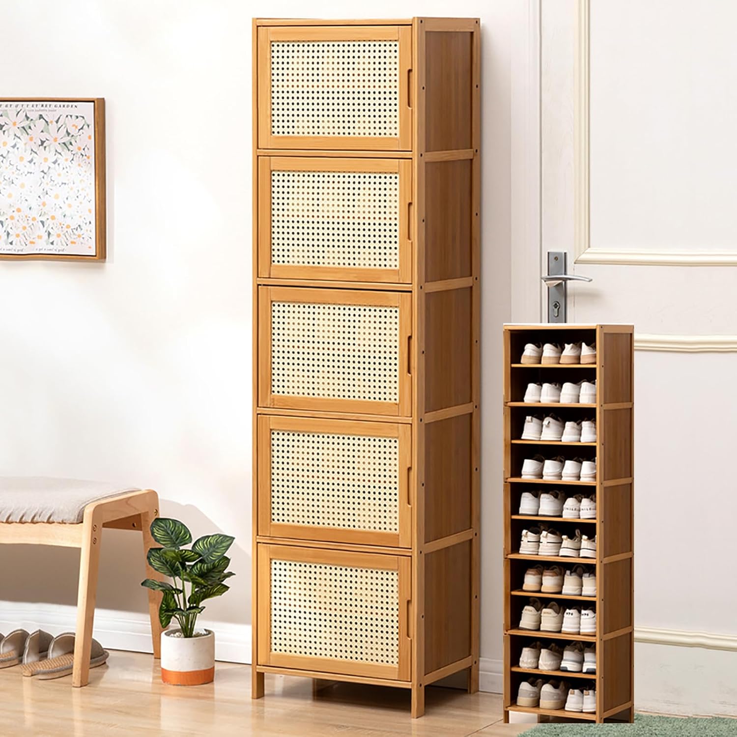 Introducing our versatile shoe rack cabinet, designed to elevate your home nization while seamlessly integrating with your decor. Made from durable bamboo and featuring elegant plastic rattan doors, this shoe cabinet offers the perfect combination of style and functionality, making it an excellent choice for any hallway or entryway. Optimize your living space with this compact shoe storage solution, ideal for small areas and tight corners. The hidden compartments help minimize clutter, allowing you to keep your footwear neatly nized and easily accessible. With its robust construction, this shoe rack provides stability and durability, ensuring your shoes are securely stored without any wobbling. Designed with a seamless laminated back panel and dust-proof side panels, our shoe cabinet keeps your shoes protected from dust and dirt, maintaining their pristine condition. Each compartment features an individual door that opens independently for quick and convenient access to your favorite pairs. The ventilated mesh door design not only promotes airflow but also enhances the overall aesthetic of your home. With a depth of 32cm, this shoe rack offers stable storage, making it a practical addition to any space. Available in multiple heights (4, 6, 8, 10, and 11 tiers), our shoe cabinet caters to various storage needs. The 11-tier option includes an open storage compartment on the top tier, perfect for showcasing decorative items or essentials. Enhance your home nization with our stylish rattan shoe cabinet, the ideal blend of design and practicality. Whether you’re tidying your entryway or seeking a chic way to store your shoes, this cabinet is tailored to meet your needs while enriching your living environment. Please be aware that minor measurement variations may occur due to manual measurement, and product appearance may vary depending on lighting and monitor settings.