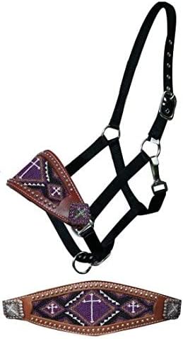 Showman beaded bronc nose halter. This halter features medium oil leather accented with silver studs and a beaded cross design inlay. The noseband is accented with crystal rhinestone cross conchos. Black nylon with adjustable crown and nose strap. Features nickel plated hardware and eyelets. For an average full size horse. Available Colors: Lime Green, Pink, Purple and Teal.