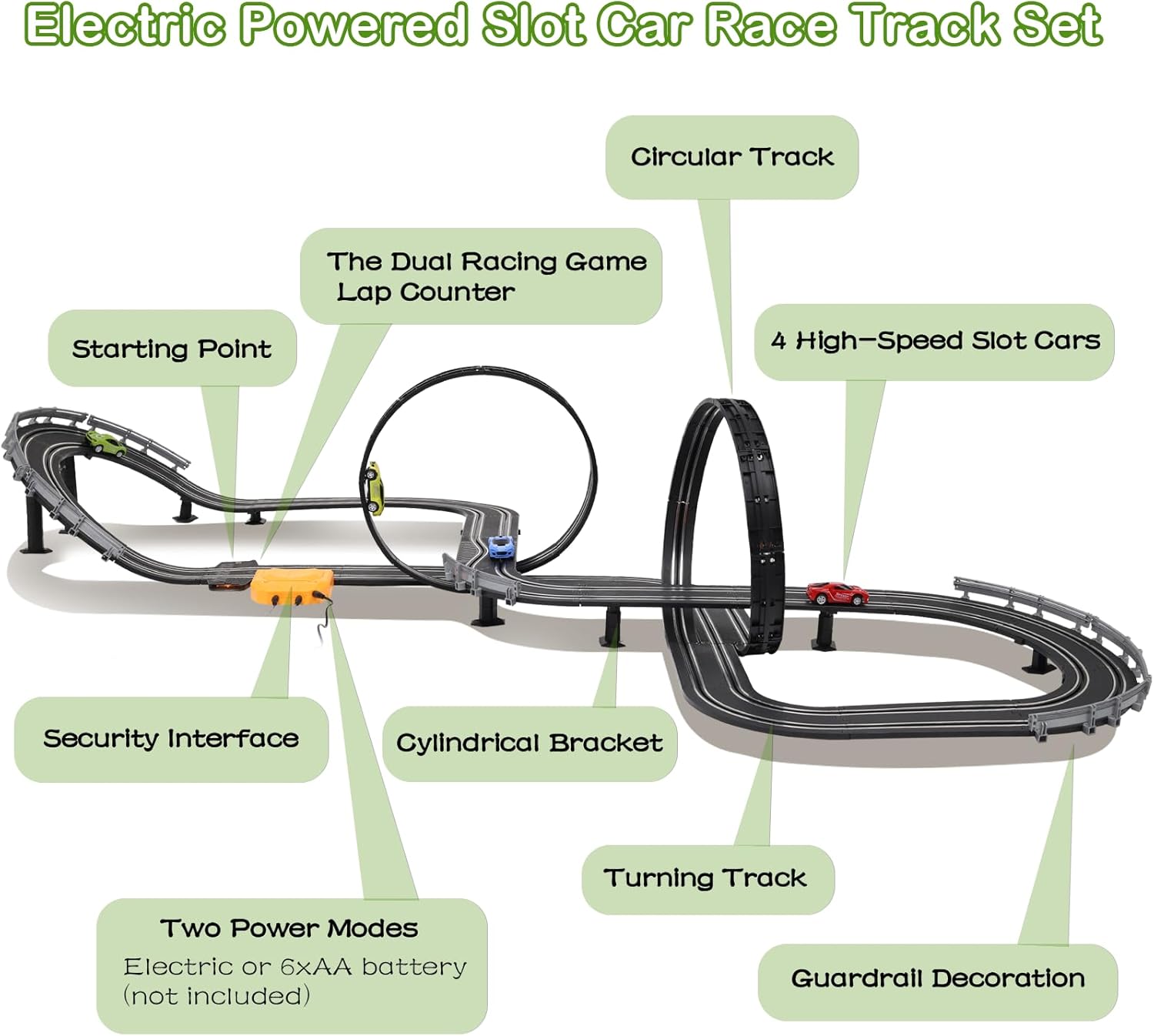 Slot Car Race Track Sets, 23ft Battery Powered or Electric Track with 4 Slot Cars, Dual Racing Game Lap Counters, Race Track Set Features a Loop, Turns, Straightaways and a Crossover for Boys Age 6-12 Start your engines and get ready to experience the thrill of slot car racing with the PAFOLO. Slot car racing brings to you the look, feel, and excitement of real race car driving but with you in control behind the wheel! Race on a course that stretches over 23-feet and features straightaways, a banked curve, a flyover, and two loops that will provide exciting action all over the track. Only the driver with the best skills can master the track and claim victory in the end! Hours of action and fun are guaranteed. The complete slot car set includes a Adapter, 43 connection tracks, 2 speed controllers, 4 toy cars, lap counter, straights, curves, banked curve, supports, 2 loops, guardrails, and a fly over.