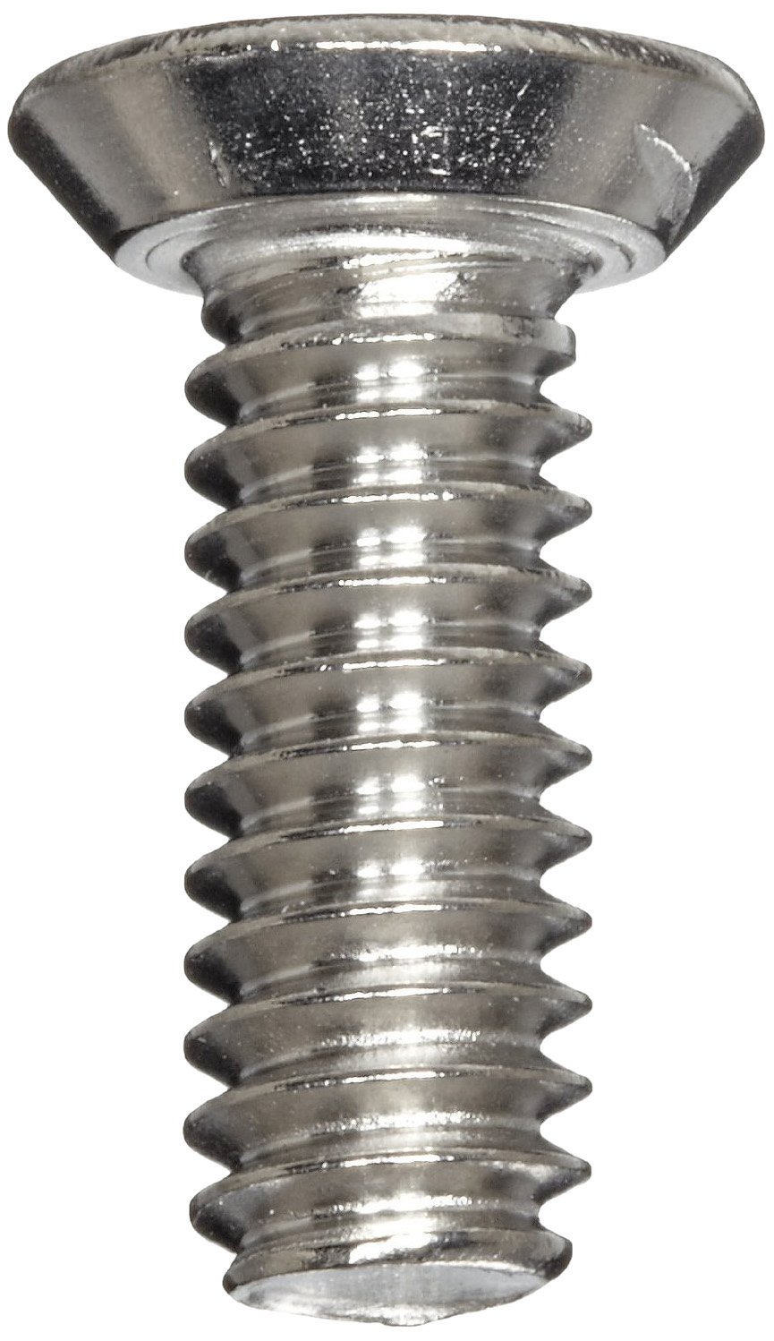 The 18-8 stainless steel machine screw has a plain finish and a flat head with a Phillips drive, and meets American Society of Mechanical Engineers ASME B18.6.3 specifications. The 18-8 stainless steel material provides strength and offers good corrosion resistance in many environments. The material may be slightly magnetic. The Phillips drive has an x-shaped slot that accepts a Phillips driver and is designed to allow the driver to slip out of the head to help prevent over-tightening and damage to the thread or fastener. The flat head is cone shaped for use in countersunk holes and has a flat top that fits flush with the mated surface. Machine screws are threaded fasteners that are typically used with nuts or drilled and tapped (threaded) holes. Machine screws are available with a variety of head shapes, which determine how the screw interacts with the mating surface, and drive styles, which determine the type of driver required to install and remove the screw.