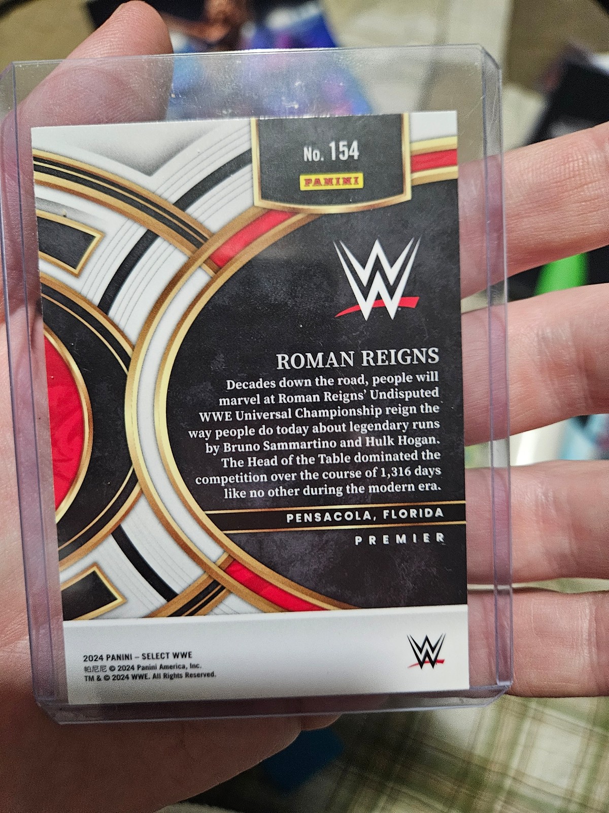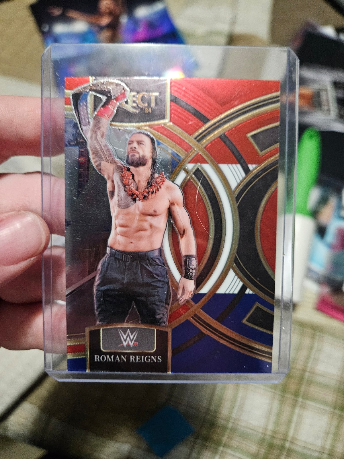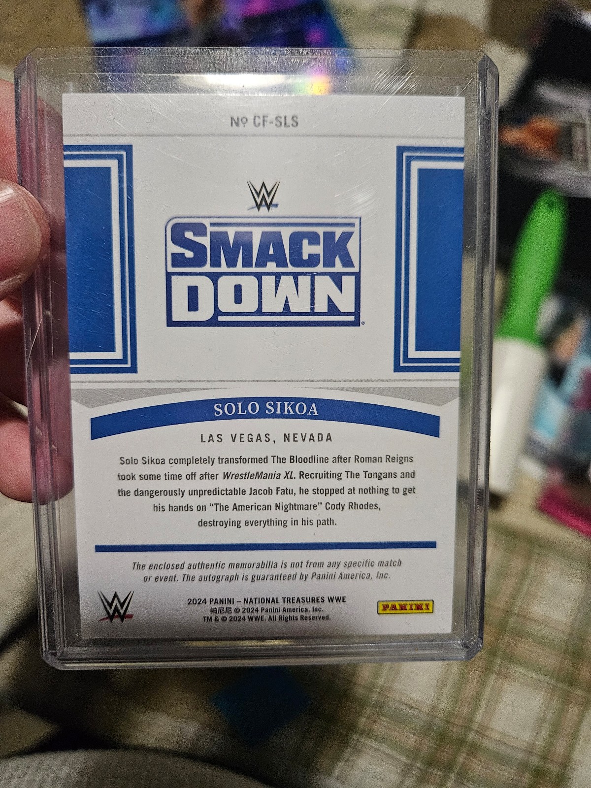 This is a 2024 autograph patch national treasures silo sikoa signed trading card by wwe and panini. You will also get this basic roman reigns panini select trading card along with it. The bloodline for you somewhat. Roman comes in a top loader and