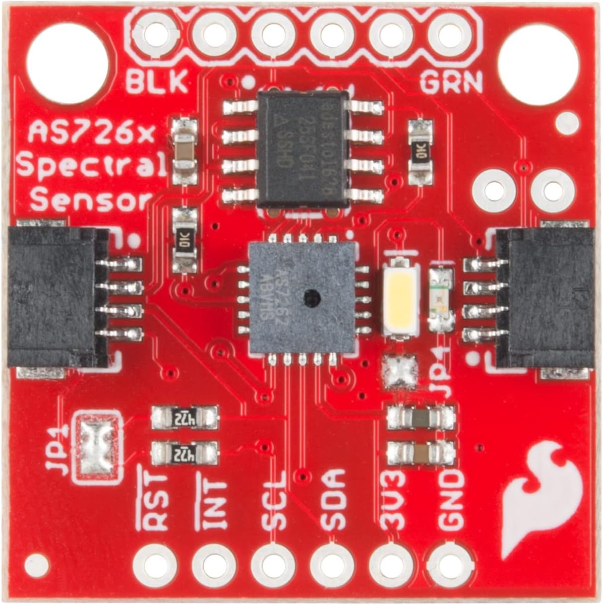 The SparkFun AS7262 Visible Spectral Sensor Breakout brings spectroscopy to the palm of your hand, making it easier than ever to measure and characterize how different materials absorb and reflect different wavelengths of light. The AS7262 Breakout is unique in its ability to communicate by both an I2C interface and serial interface using AT commands. Hookup is easy, thanks to the Qwiic connectors attached to the board --- simply plug one end of the Qwiic cable into the breakout and the other into one of the Qwiic Shields, then stack the board on a development board. You’ll be ready to upload a sketch to start taking spectroscopy measurements in no time.The AS7262 spectrometer detects wavelengths in the visible range at 450, 500, 550, 570, 600 and 650nm of light each with 40nm of full-width half-max detection. The board also has multiple ways for you to illuminate objects that you will try to measure for a more accurate spectroscopy reading. There is an onboard LED that has been picked out specifically for this task, as well as two pins to solder your own LED into.NOTE: The I2C address of the AS7262 is 0x49 and is hardware defined. A multiplexer/Mux is required to communicate to multiple AS7262 sensors on a single bus. If you need to use more than one AS7262 sensor consider using the Qwiic Mux Breakout.The SparkFun Qwiic Connect System is an ecosystem of I2C sensors, actuators, shields and cables that make prototyping faster and less prone to error. All Qwiic-enabled boards use a common 1mm pitch, 4-pin JST connector. This reduces the amount of required PCB space, and polarized connections mean you can’t hook it up wrong.