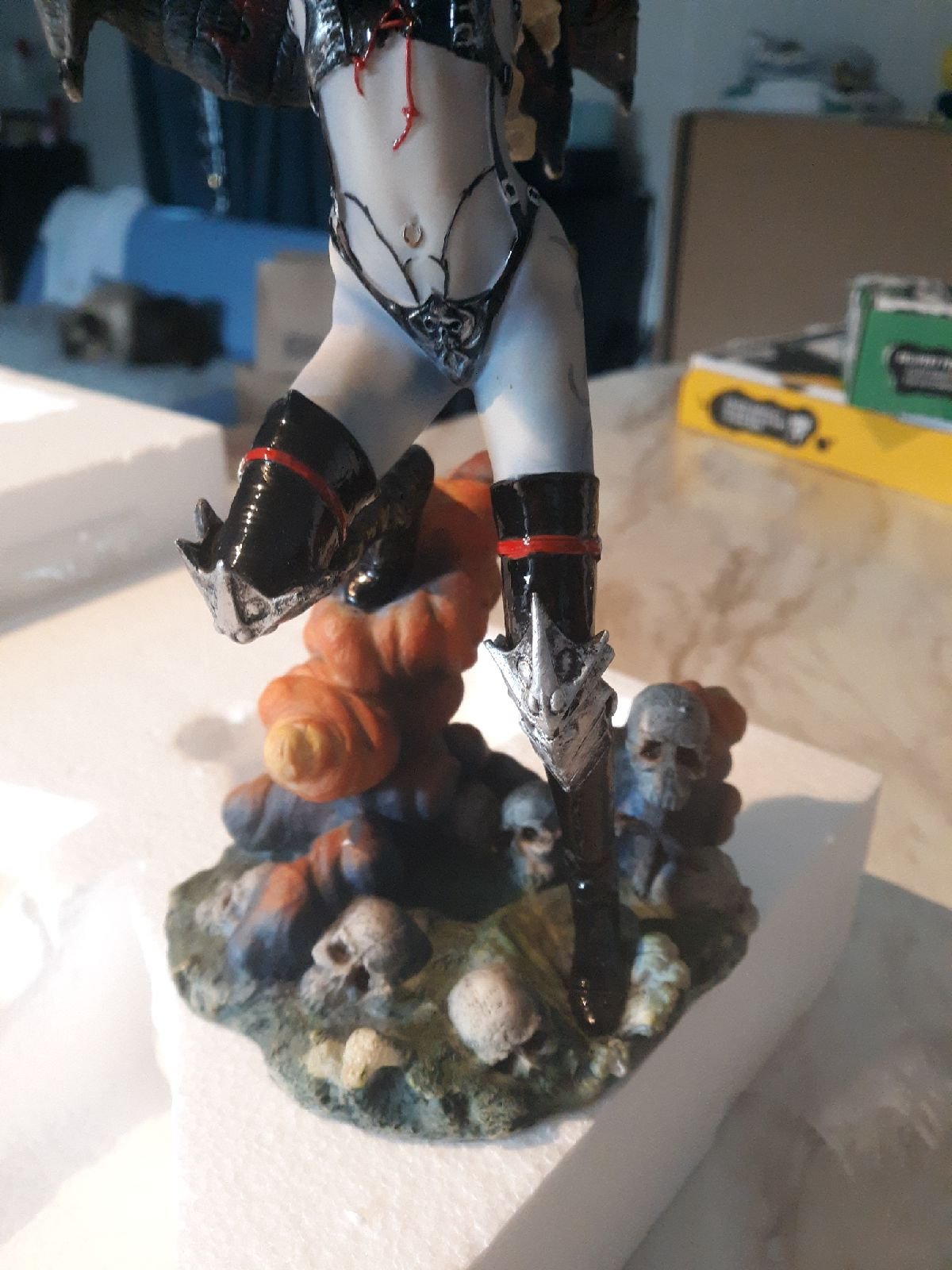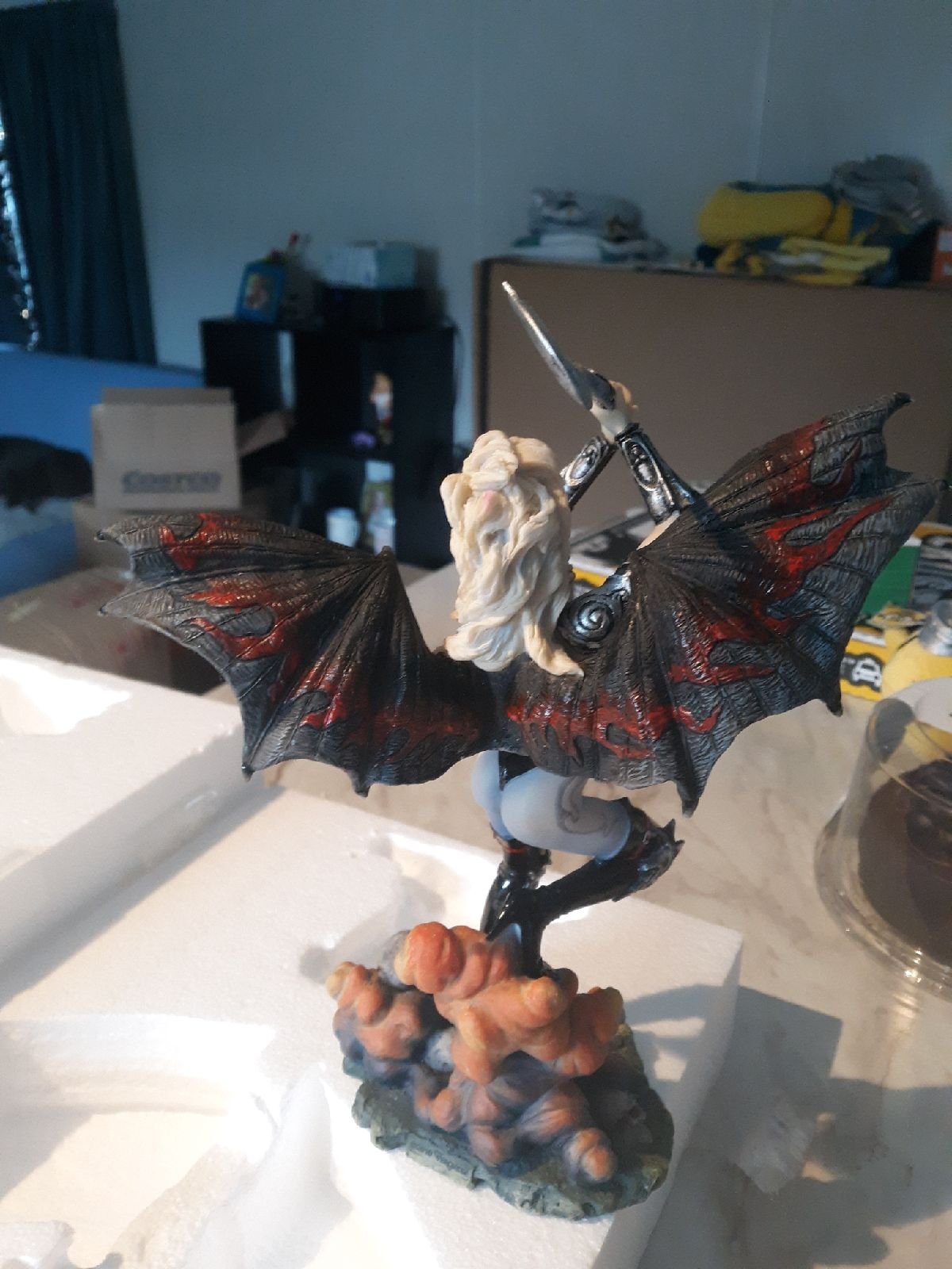 She is absolutely beautiful! Shes been one of my favorites. She has been out of the box, but in a glass curio cabinet. Her box is in perfect condition as well. I think she is retired, but not 100% sure. She is 10 inches from base to tip of her sword