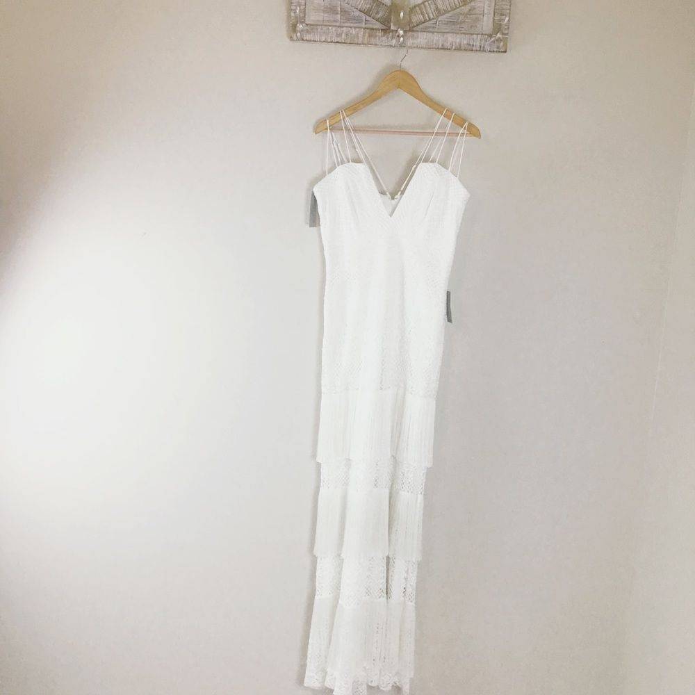 Boho meets Hollywood glam on this beautiful V-neck sheath wedding dress, featuring triple spaghetti straps, allover crochet lace, and a fringe column skirt.