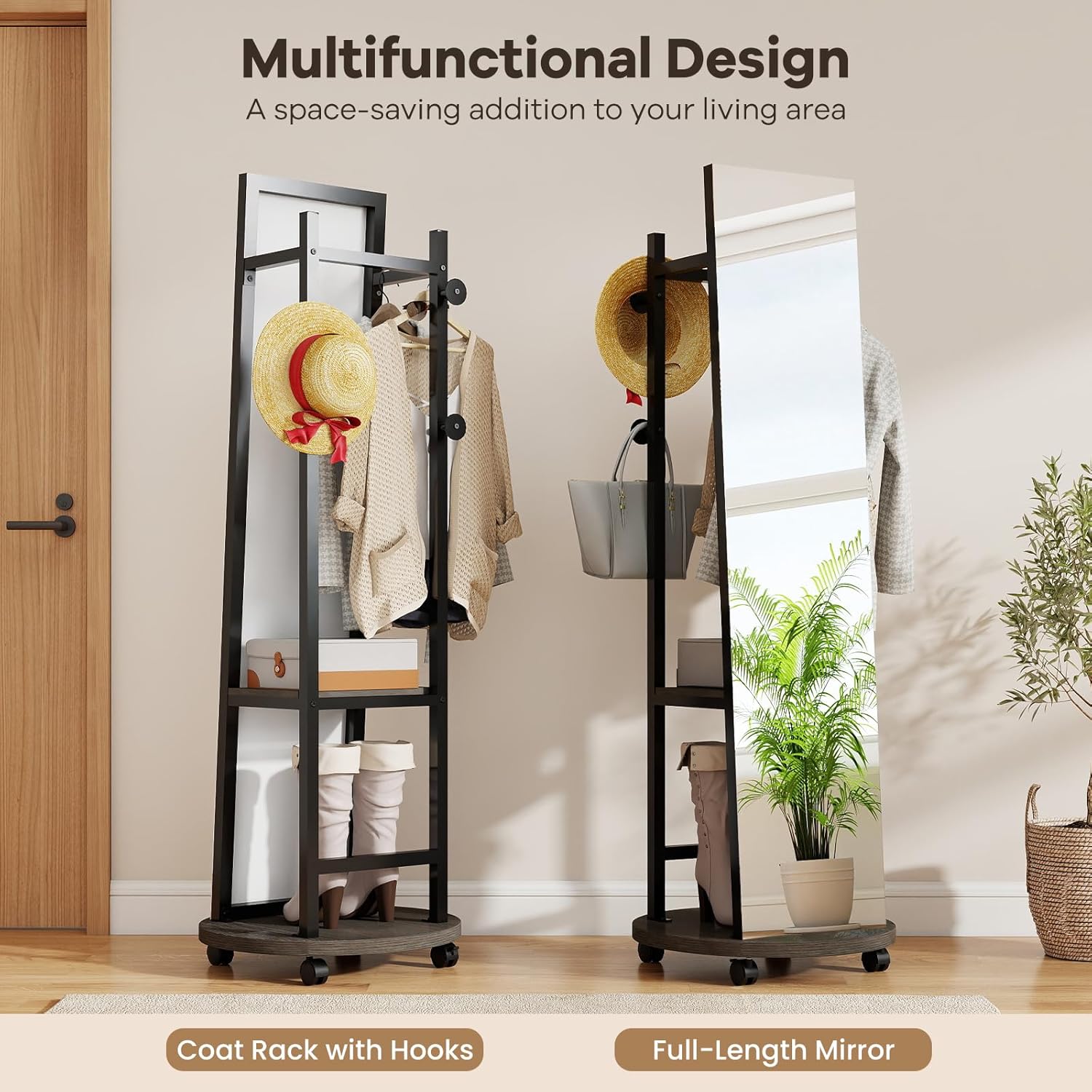 Description:Maximize your space with this innovative full-length mirror and coat rack combo, designed for both style and functionality. Featuring hanging rods, 3 hooks, and 2 spacious shelves, the clothes stand provides versatile storage for coats, hats, shoes, and more. Equipped with 2 lockable casters, it offers effortless mobility and secure placement. Crafted with a sturdy metal frame and a premium glass mirror, the clothes hanger rack ensures durability and safety. Moreover, the attractive wood-textured shelves add a warm, elegant touch to any entryway, living room, or bedroom, making it a truly practical and beautiful addition to your home.Features:Combine full-length mirror with coat rack to save space4 casters for effortless movement and positioning2 of casters are lockable to ensure stability and safetyMultiple hooks and rods for versatile hanging options2-tier shelves provide ample storage for shoes and bagsSturdy metal frame and robust panels for long-lasting durabilityExplosion-proof HD mirror enhances user safetyWood-textured shelves add stylish, functional home decorationIdeal for entryway, living room, bedroom and so onAssembly is requiredSpecifications:Color: Black & Walnut/White & NaturalMaterial: Engineered Wood, MetalOverall Dimensions: 18" x 53"/45 x 135 cm (Dia x H)Full Length Mirror Size: 11.5" x 55"/29.5 x 139 cm (W x H) Storage Shelf Size: 11.5" x 9"/29.5 x 22.5 cm (L x W) Total Weight Capacity : 100 lbs/45 kgNet Weight: 22.5 lbs/10 kg1 x Coat Rack with Mirror1 x User’s ManualWhy You Choose Our Coat Rack with Mirror ?√ Integrated full-length mirror and coat rack save valuable floor space√ Smooth-rolling lockable wheels offer easy mobility and secure placement