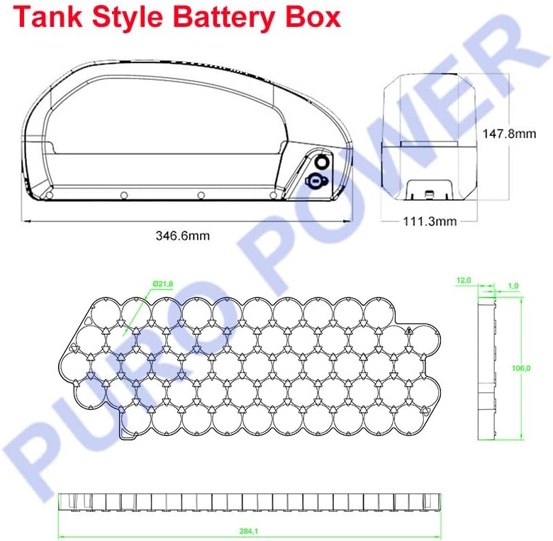 Tank Style eBike Battery Case Fits 56PCS 21700 Cells 48V Battery Box For DIY Fuel Tank E-Bike Battery Pack E-scooter Electric Motorcycle Adult Electric Bike Conversion Kit Tank Style Battery Box, Fits 56pcs 21700 Cells, with holder, without battery Charging Port: DC 2.1 Discharging Port: (2+4)PIN LED indicator: 3 LED Lights USB port: without Power switch: with Controller box: without