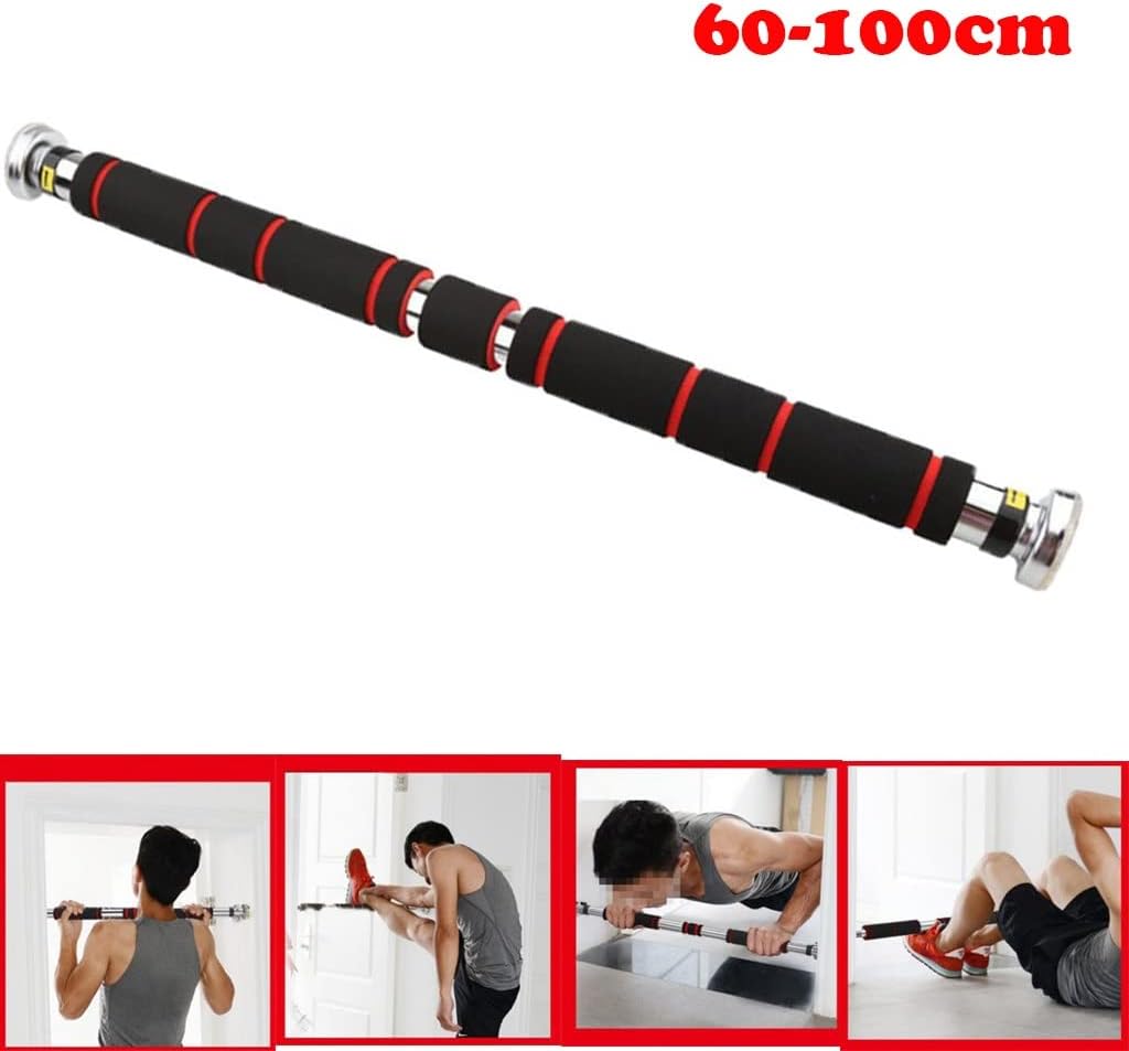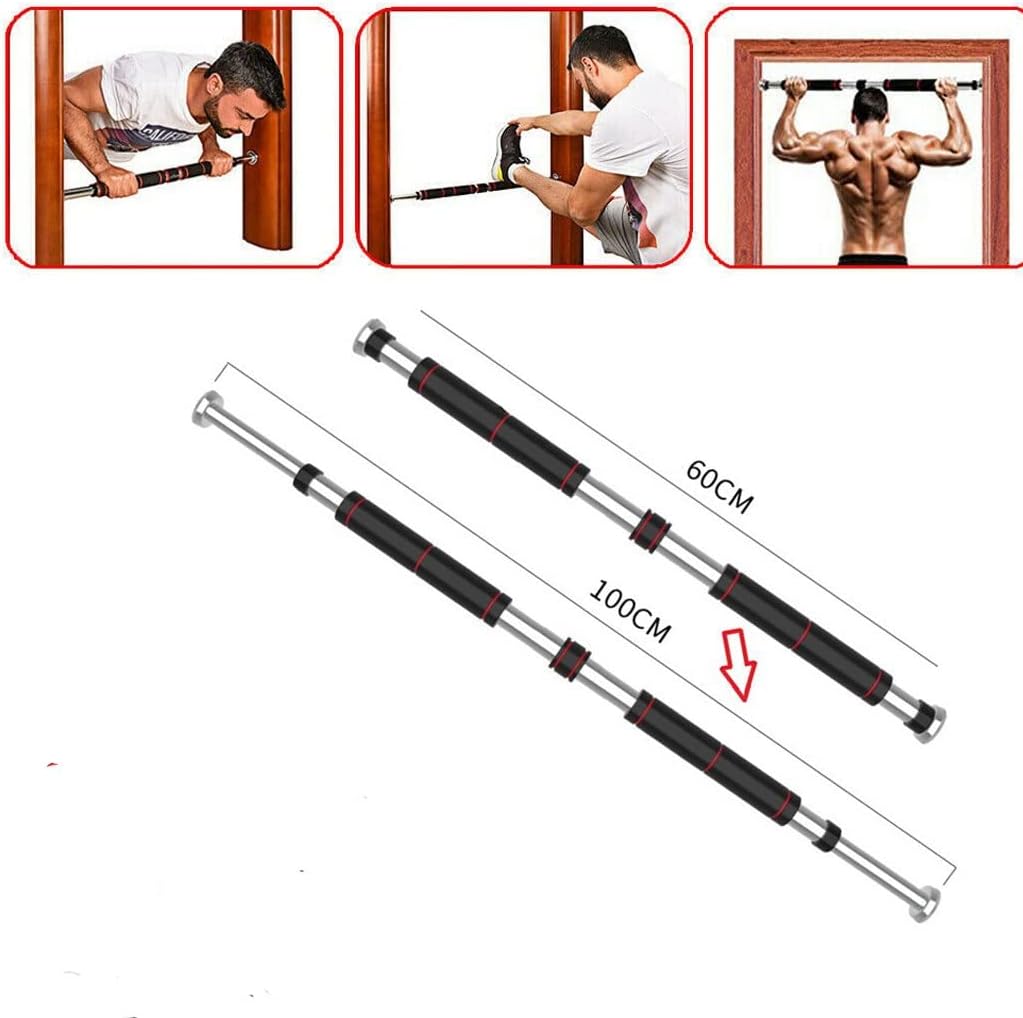 Extra Thick steel pipe provides sturdy, solid support with 200kg/ 440lbs loading bearingAdjustable: telescopic design can be extended from 60-100cm/80-130cm to fits various size door waysFoam Padded grips absorbing sweat, anti-, providing extra comfort to minimize hands fatigueEasy Installing: no drills needed and easy to assemble and disassemble and would not scratch your door framesMultifunctional: can do various exercises such as , chin-ups, sit-ups, push-ups, crunches, stretching and etc.Specification:Material: Steel, FoamSize: 60-100cm/ 23.6-39.9 inchPackage Included:1* pull up barActivity: Bodybuilding, Gym & Training, Weight Lifting