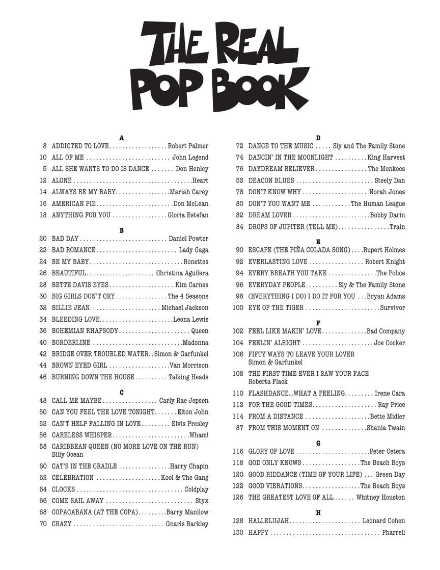 The Real Pop Book – Volume 1 is a must-have fake book for musicians, singers, and teachers who love pop, rock, and contemporary hits. Designed for C instruments including piano, guitar, and voice, this collection features over 200 songs in the trusted Real Book format. Perfect for performances, lessons, or home practice, it’s an invaluable resource for players of all levels looking to expand their repertoire with accessible, flexible arrangements.What’s Inside: This comprehensive pop fake book includes melody lines, lyrics, and chord symbols for hundreds of classic and modern hits. Songs are transcribed in clear, easy-to-read notation and organized for quick reference during live gigs or rehearsals. The durable comb binding ensures pages lay flat on the music stand, making it ideal for both studio and stage use.How It Helps: Musicians can use this versatile collection to improve chord reading, accompaniment, and improvisation skills while playing timeless favorites. It’s an excellent resource for music teachers, students, and performers who want to strengthen sight-reading and harmony knowledge. Whether you’re learning new songs, building a setlist, or leading singalongs, this book supports creativity and confidence through familiar music that inspires consistent practice and joyful performance.Full Song List: Addicted to Love * All She Wants to Do Is Dance * American Pie * Bad Day * Billie Jean * Bohemian Rhapsody * Bridge over Troubled Water * Cat’s in the Cradle * Clocks * Dancin’ in the Moonlight * Every Breath You Take * Hey Jude * Hotel California * Imagine * Piano Man * Rolling in the Deep * Tears in Heaven * You’ve Got a Friend * and more.Bring music to life. The Real Pop Book is the ultimate reference for pop and rock musicians seeking versatility, inspiration, and enduring songs that never go out of style. Read more