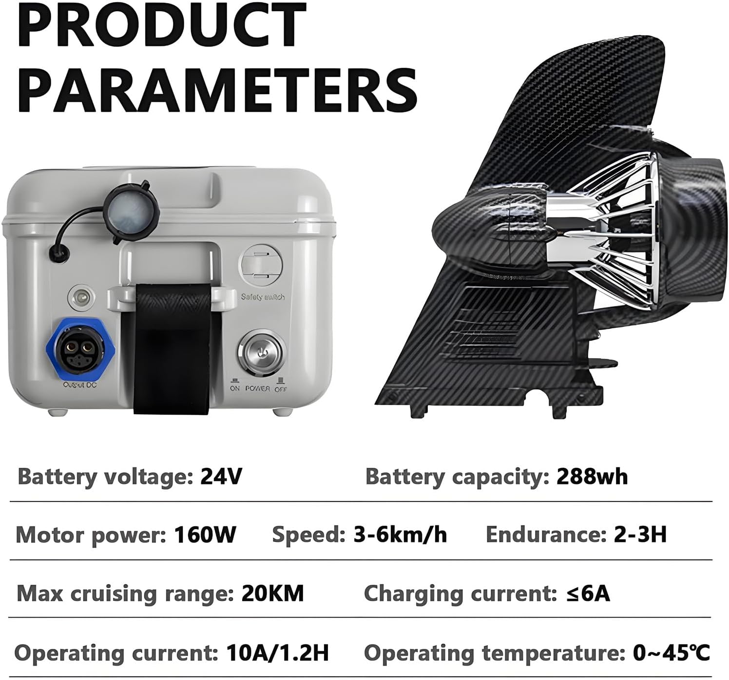 Specification: Electric propulsion parameters: Motor power: 160W Speed: 3-6 km/h Battery life: 2-3 hours The longest cruising range: 20KM Packing volume: 450X435X120MM Occasion: Offshore waters Gross weight: 2KG Battery parameters: Net weight/gross weight: 3.7KG/3.86KG Waterproof grade: IP7 Voltage: 24V Capacity: 288wh Charging current: <6A Continuous working current: 10A/1.2H Working temperature: 0~45℃ Packing volume: 235X195X155MM Package includes: 1X Thruster 1X Screw set 1X Spare propeller 1X Charger Service: If you have any questions, please contact us, we will reply to you as soon as possible within 24 hours.