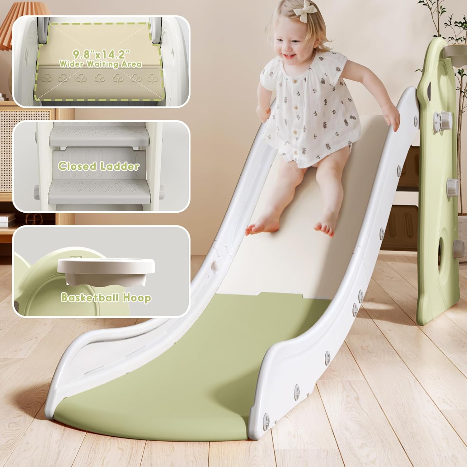 Guardian of Giggles: Unparalleled Stability: Experience unmatched stability with features like anti-slip padding, our toddler slide is a guardian of your child's joyful escapades. Vibrant Playmate: Crafted with a safety embrace for smooth glides, the frame's basketball hoop is like a cheering buddy. Infusing glee and security, it unlocks energetic play, kindling athletic potential, and guiding kids on a secure, exhilarating journey on your indoor playground. Sculpted Elegance for Your Home: Elevate your haven with our kids slide carefully sculpted elegance, turning your space into a canvas of shared adventures. Eco-Conscious Design: Crafted from environmentally-friendly HDPE material, our slide ensures both safety and sustainability. Just like a nature's protector, it lets your child play responsibly and joyfully. Threads of Love, Woven in Play: Weave threads of love as you join in the play, strengthening the tapestry of connections between you and your little ones. Parents' Top Choice: Trusted by countless families for its exceptional quality and design that exceeds expectations. With a dedicated after-sales team, any issues are promptly resolved, ensuring a worry-free shopping experience.