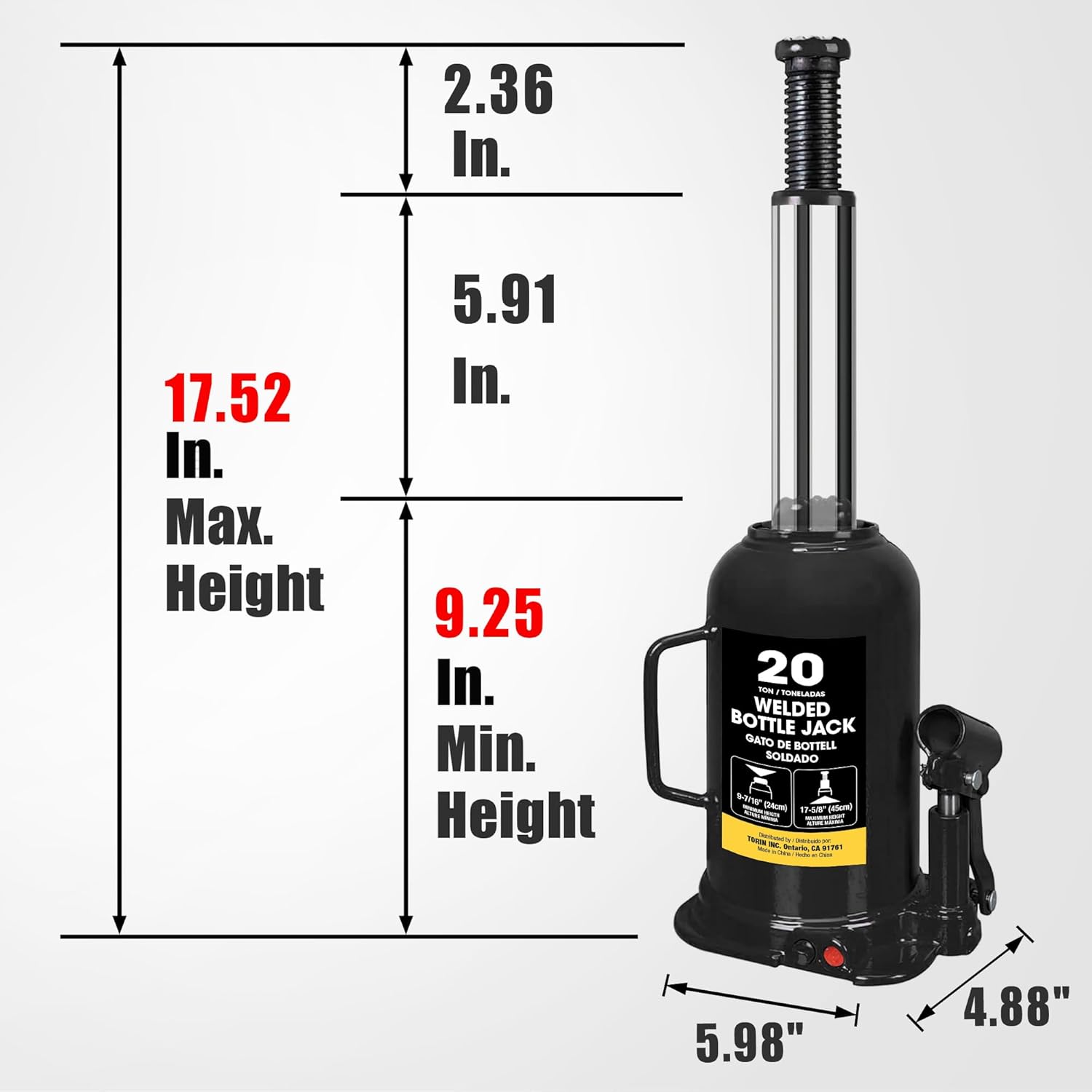 The Torin AT92003BB hydraulic bottle jack is designed for residential and commercial use. It is industrial welded and engineered using a drop forged alloyed steel construction that is ideal for quality and durability. The inner/outer welded structure delivers leak-free performance and has a longer operation life and an overall stronger build compared with traditional screw jacks. The fully welded structure is designed for hard-hitting commercial use, making large loads easy to lift. A wide, rugged base adds stability and strength. Features a lifting range of 9-7/16" to 17-5/8" with a 20 ton (40,000 lb) capacity. It has a lifting height of 5-7/8" and an adjustable screw top extension that adds an additional height of 2-3/8". The high-quality, glide-action pressure pump designed to lift with minimal muscle and effort and has an integrated built-in oil-bypass and overload valve that protects the hydraulic system from extending beyond its travel limits. Hydraulics are powered with a high-quality oil, which offers better corrosion resistance and high/low temperature flexibility, allowing the unit to operate at temperatures between 40 degrees Fahrenheit and 105 degrees Fahrenheit. Piston ram utilizes a Y-style polyurethane sealing ring with backup ring, preventing the load from falling slowly. This powerful bottle jack is ideal for lifting cars, trucks, SUVs, farm vehicles, heavy-duty machinery and industrial equipment. It can also be used for military applications, agricultural and industrial environments where the equipment receives heavier abuse. This unit is 100% factory tested for reliability and safety to meet and comply with ASME PASE safety standards. Includes a limited 1 year manufacturer warranty.