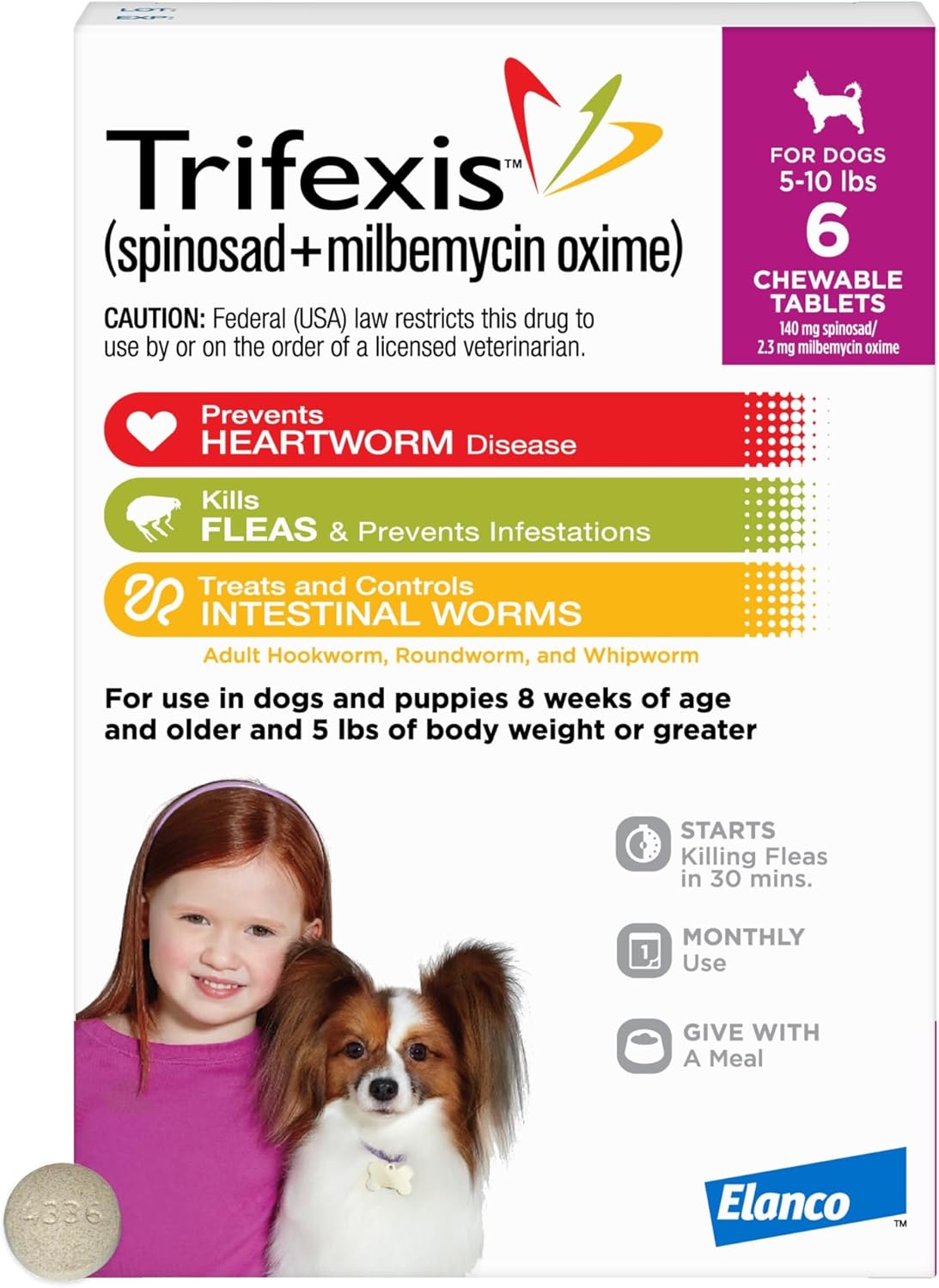 | Directions | TRIFEXIS is given orally, once a month at the minimum dosage of 13.5 mg/lb (30 mg/kg) spinosad and 0.2 mg/lb (0.5 mg/kg) milbemycin oxime body weight. For heartworm prevention, give once monthly for at least 3 months after exposure to mosquitoes |