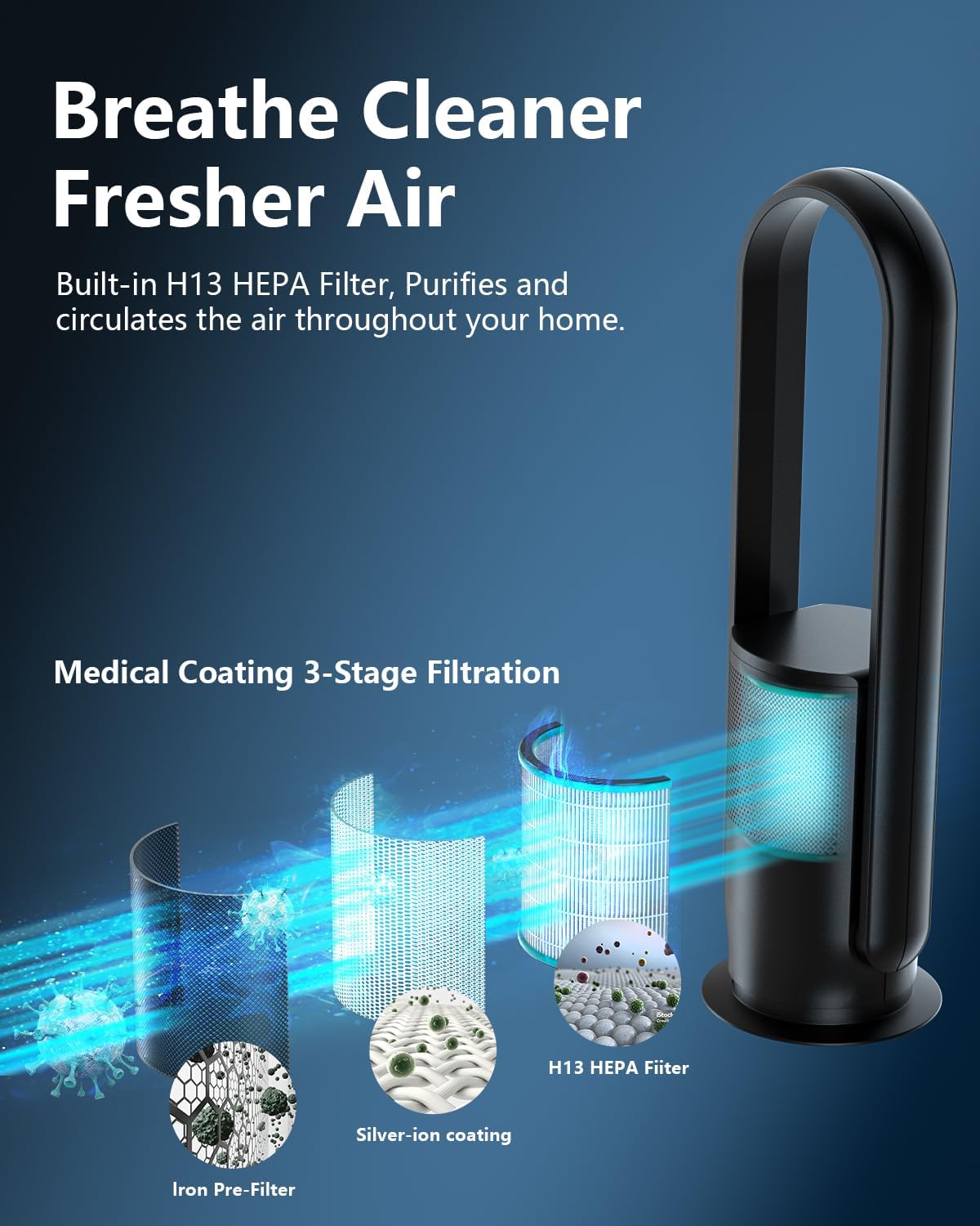 ULTTY Bladeless Tower Fan and Air Purifier in one, True HEPA Filter 99.97% Smoke Dust Pollen Dander, Oscillating Tower Fan with Remote CR022D