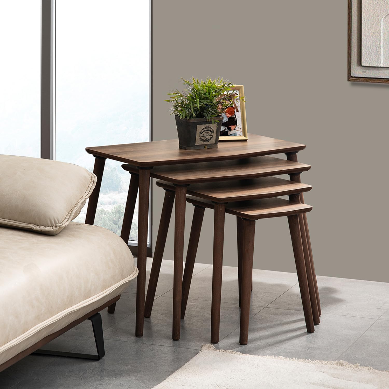 Table Material: Made of Mdf / Wood material. Foot Features: The feet are made of wood (ROWN ROWN) material. Additional Information: Shipped disassembled. The wood is painted with protection. Underfoot fleece Installation: The table top tables and legs are delivered disassembled. You can install the brackets under the top tables by hand turning the screws on the feet. No tools, screwdrivers, etc. It is very simple. PRODUCT MEASUREMENTS WIST SIZE HEIGHT LARGEST : 70cm 40cm 55cm LARGE : 55cm 40cm 50cm MEDIUM: 40cm 40cm 45cm SMALL: 26cm 40cm 40cm