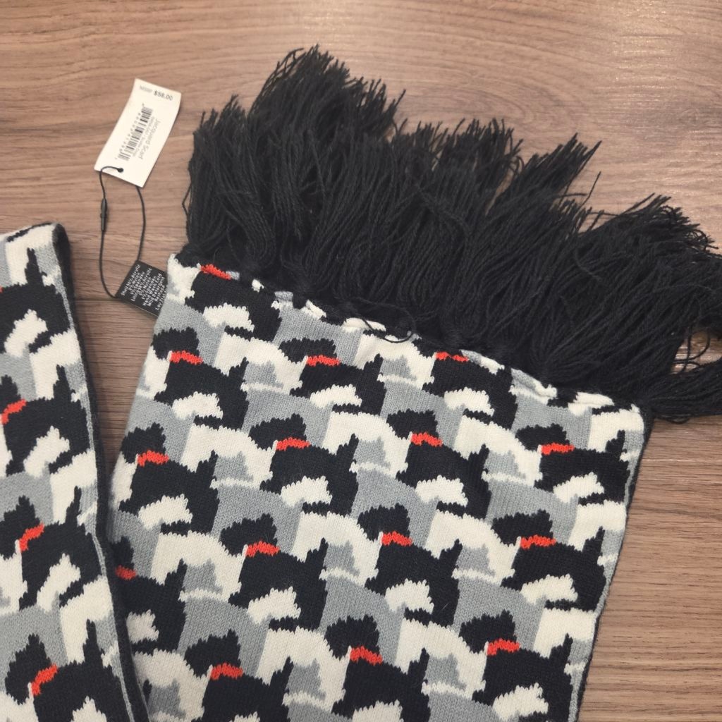 Featuring a repeating pattern of Scottie dogs in black, white, and gray, with small red accents on their collars on one side, the other side is black. The scarf has black fringe at both ends. A black fabric tag with "Vera Bradley" in white lettering is sewn into one end.