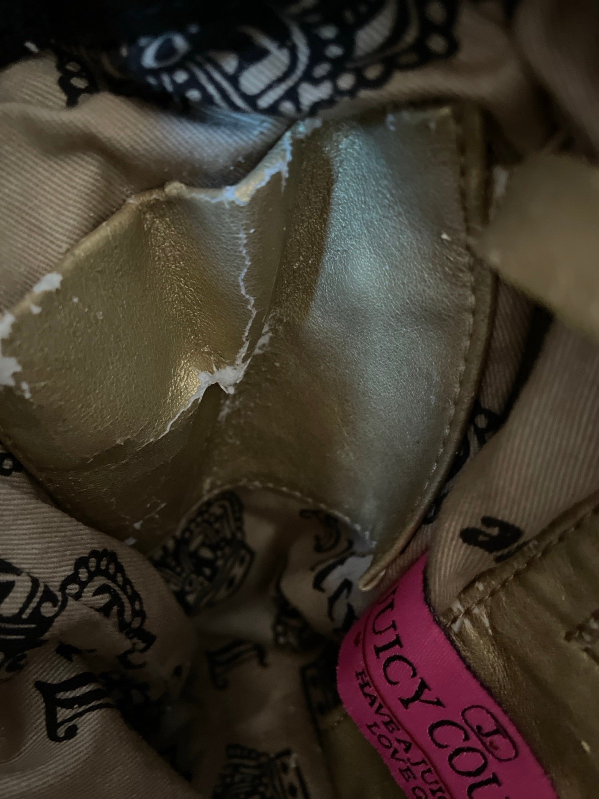 The terry cloth and embroidery have snagging and pulls, I think most of the snags could be corrected with scissors or a shaver. The mirror charm has peeling on the string attachment but the actual charm looks good. There is also peeling on the two inner side pockets but the rest of the interior looks pretty good.