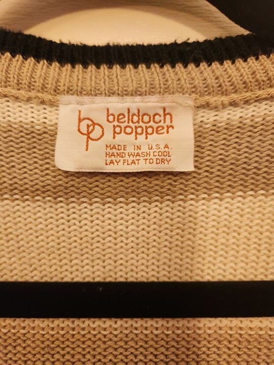 This is a Vintage 80's Beldoch Popper Open Front Stripped Cardigan Sz L. Made in the USA of cotton/polyester blend this beige and white stripped cardigan features cable knitting on the front with black pipping on the edges. It has been gently worn and is in excellent condition.