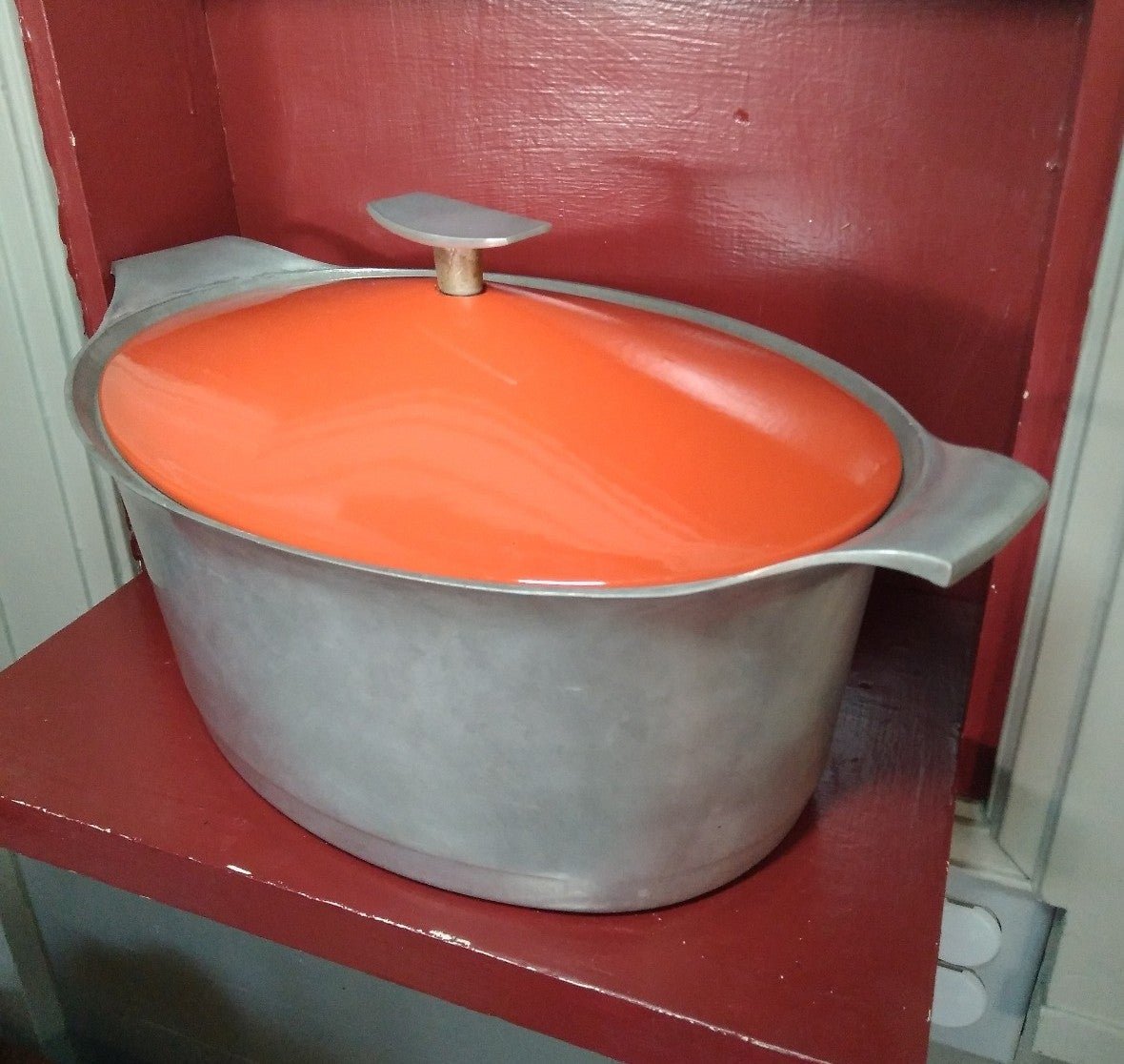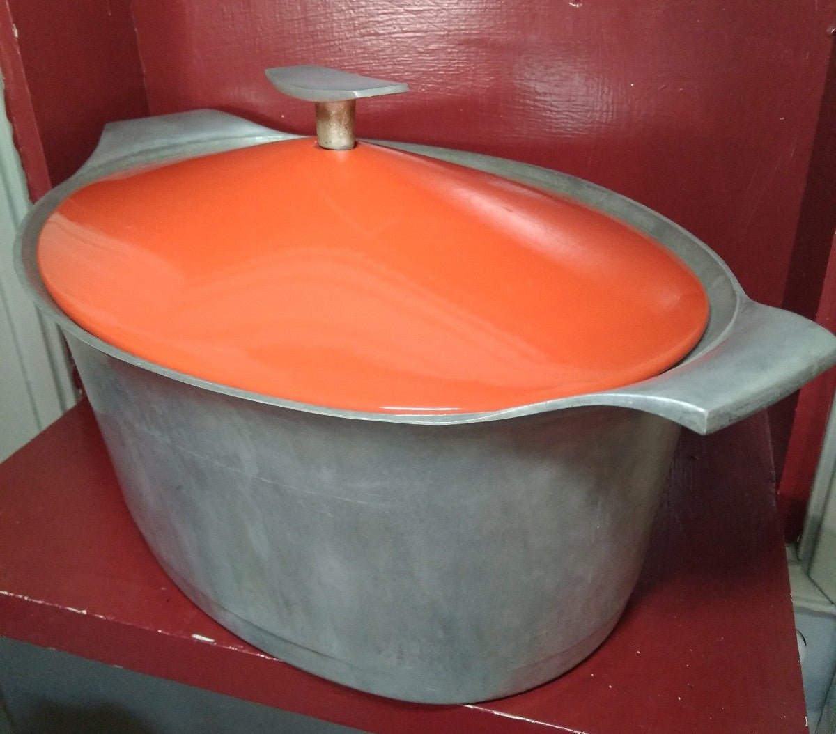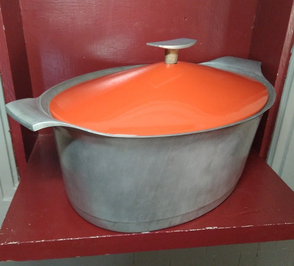Vintage Griswold no. 99 aluminum roaster with enamelware orange lid. In good used vintage condition showing signs of use throughout. Measures aprox: 16.5" handle to handle, 5.5" deep, 10" across. Great hard to find piece for any cabin kitchen collection or camping set up. Please look at pictures they are part of the description, you will recieve exactly what is pictured. Ask any questions before buying.