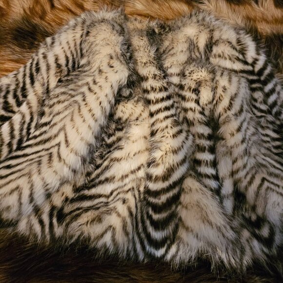 Vintage Moda International chevron style faux fox fur coat is so soft, thick and warm. Done with a beautiful black and white chevron pattern, this coat is going to turn a few heads. It closes fully to keep you warm and is perfect for any casual winter event. A medium/large on the label it measures 26" long from the bottom of the neckline to the hem, 42: bust, 17" shoulders (across the back), and 20" sleeves. All my items come from a pet and smoke free home and are odor free. Please check my page weekly for more new and pre-owned furs and faux furs.