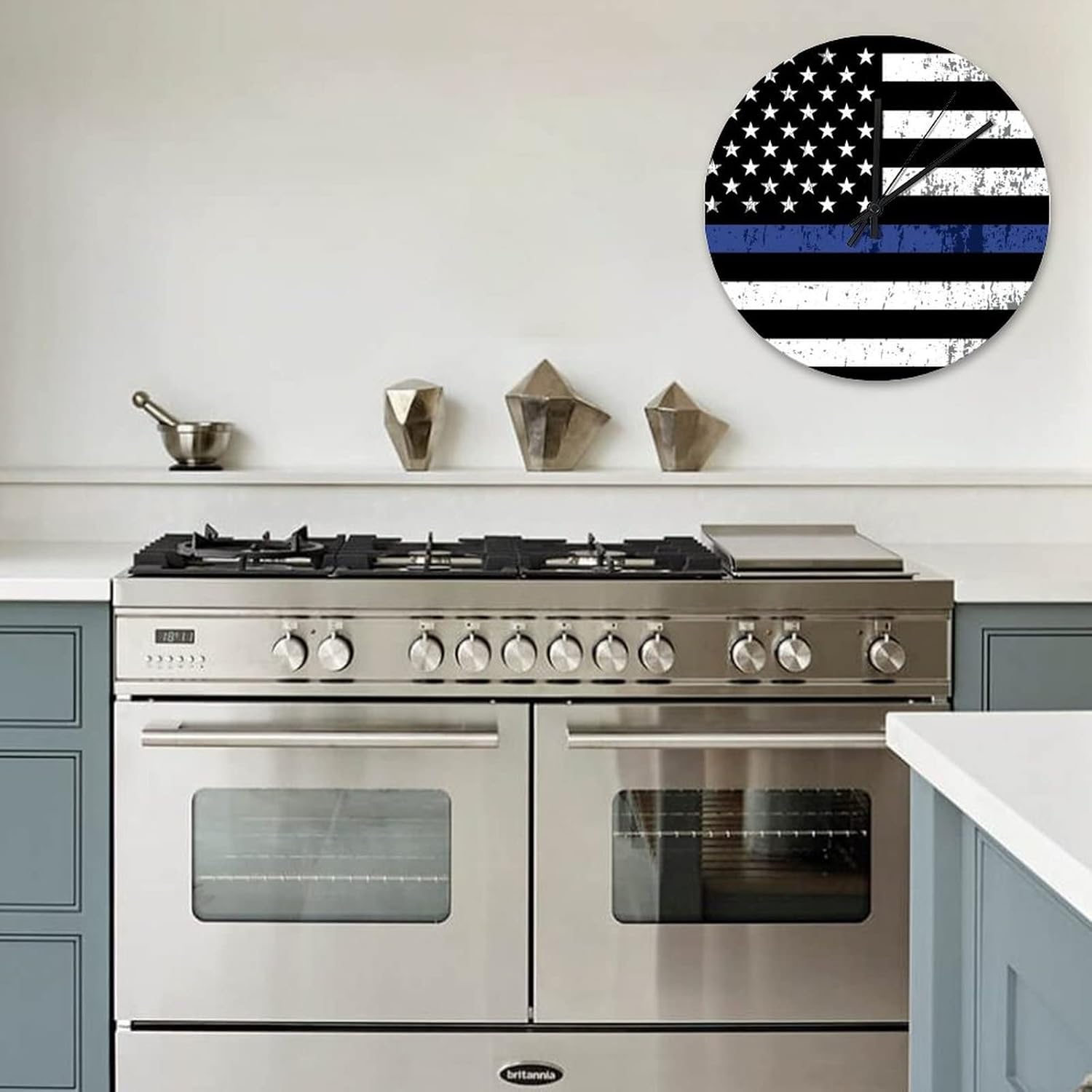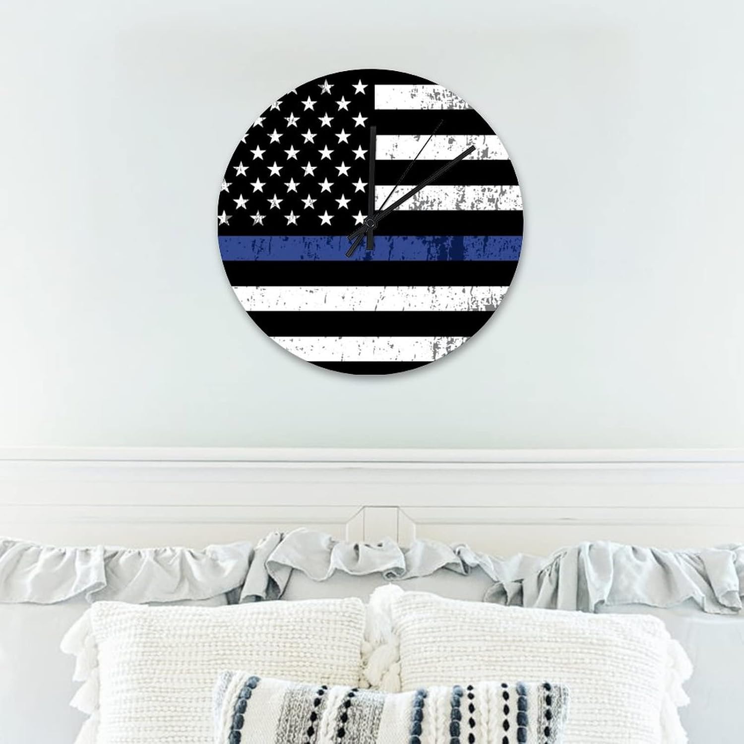 Retro Vintage Thin Blue Line Black American Flag Wood Clock Law Enforcement and Police Officers Wooden Decorative Battery Operated Round Clock Bedroom Living Room Home Decor 15x15 in??Details:Product Size: 10/12/15 inches, (25/30/38 cm)Shape:RoundMaterial: Wood??Functional Home DécorThis Honoring Law Enforcement Officers clock aren't just for timekeeping. They function as beautiful wall decor pieces, beyond telling time, and bring both style and purpose to any room.A charming home decoration, very suitable as a housewarming gift, making the home more warm. Suitable for any room, you can put it in any room such as home, living room, master bedroom, kitchen, bathroom, home office, etc. Elegant, durable and stylish.??Clock Hands Troubleshooting Guide:Check that the battery is a new battery and not a used battery.Make sure the hour and minute hands are not crossing or touching each other. If they are, adjust the hands by slightly bending them.See if the center pin that holds the hands together is firmly pushed in or screwed on, depending on the style.If hands are still not moving after the above, please reference the hands replacement instructions included with all of our open face clocks.