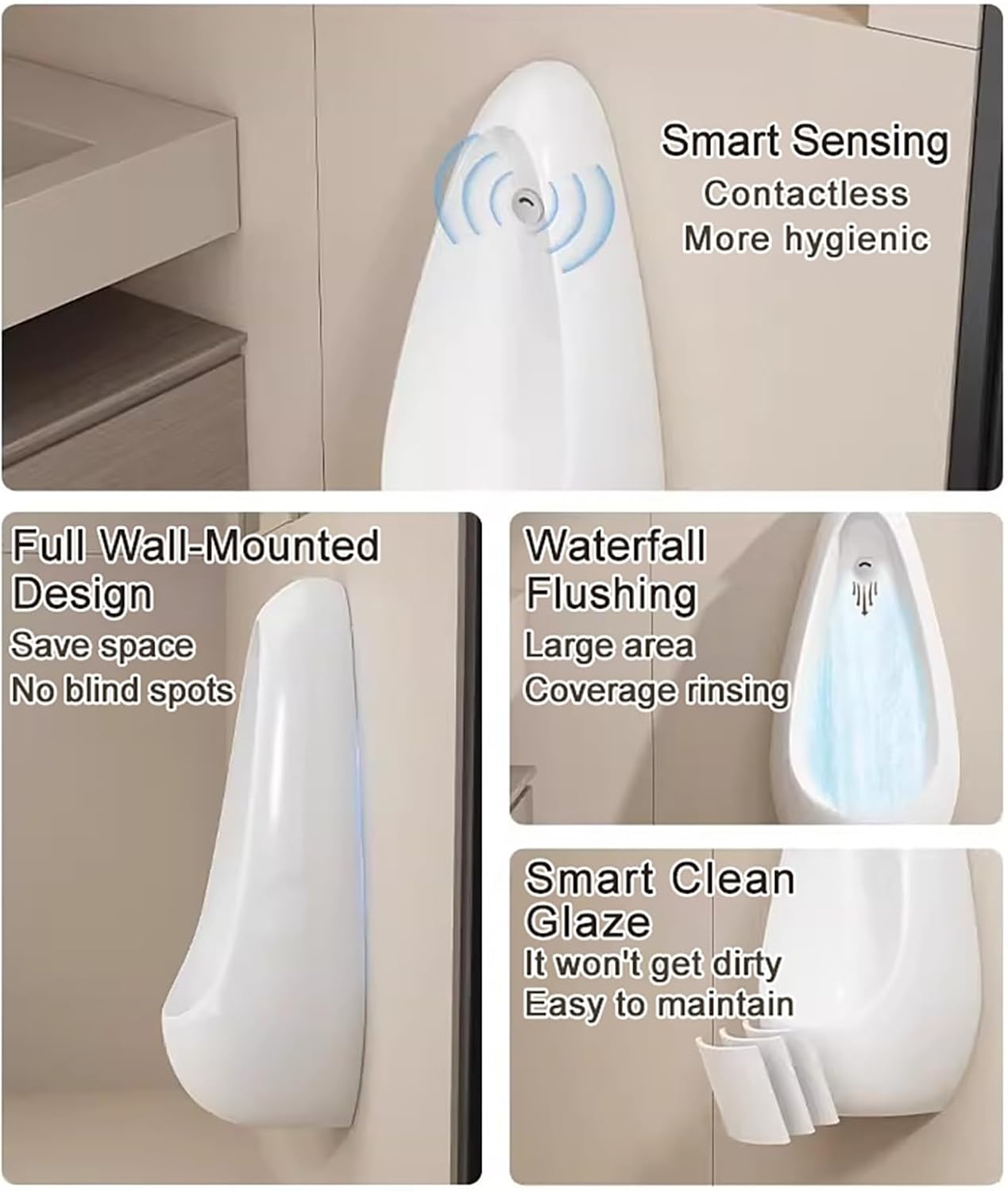 Universal Washout High Efficiency Urinal Wall Mounted Men's Adult Urinal Intelligent Sensor FlushProduct DescriptionThis wall mounted men’s adult urinal combines a sleek, space-saving appearance with intelligent features that enhance cleanliness and convenience. The intelligent sensor flush allows for hands-free operation, promoting a more hygienic environment by eliminating the need for manual flushing. It’s the solution for public restrooms, hotels, and upscale bathroom facilities where performance and sanitation are top priorities.Crafted from sturdy,high-temperature fired ceramic, this universal washout high efficiency urinal ensures long-lasting use and an easy-to-maintain glossy finish. The advanced microcrystalline glaze prevents stains and discoloration, keeping the surface bright and fresh with minimal effort. With its powerful waterfall-style washout design, each flush provides full-area coverage, effectively removing any residue while conserving water. The spill-proof nighttime induction urinal is designed to eliminate unpleasant smells and clogging. It features an innovative odor-sealing ceramic trap that effectively blocks odors from escaping, maintaining a consistently fresh environment. Unlike traditional urinals that require frequent cleaning, this model’s intelligent flushing and self-cleaning features help reduce cleaning time and improve hygiene standards across all types of restrooms.Installation is straightforward and secure, with a structure that provides stability and practicality for long-term use. The combination of its minimalist design, intelligent sensor flush system, and high-efficiency water performance makes it not only user-friendly but also conscious. The efficient washout mechanism reduces water usage without compromising cleaning effectiveness, aligning with sustainable facility management practices.For bathrooms hotels and restrooms,this urinal embodies the balance of functionality and sophistication. Every detail — from the smooth glaze to the intelligent induction system — has been engineered to improve user experience and operational efficiency. Whether you are upgrading your commercial restroom or enhancing your private bathroom, the universal washout high efficiency urinal delivers reliability, cleanliness, and modern appeal in one refined design.Product Packaging1x Urinals for Men No overflow Nighttime1x Set of Installation HardwareNote:There may be an error of 1-3 cm.Images are for illustrative purposes; additional items shown are not included.Colors may vary slightly due to monitor differences.