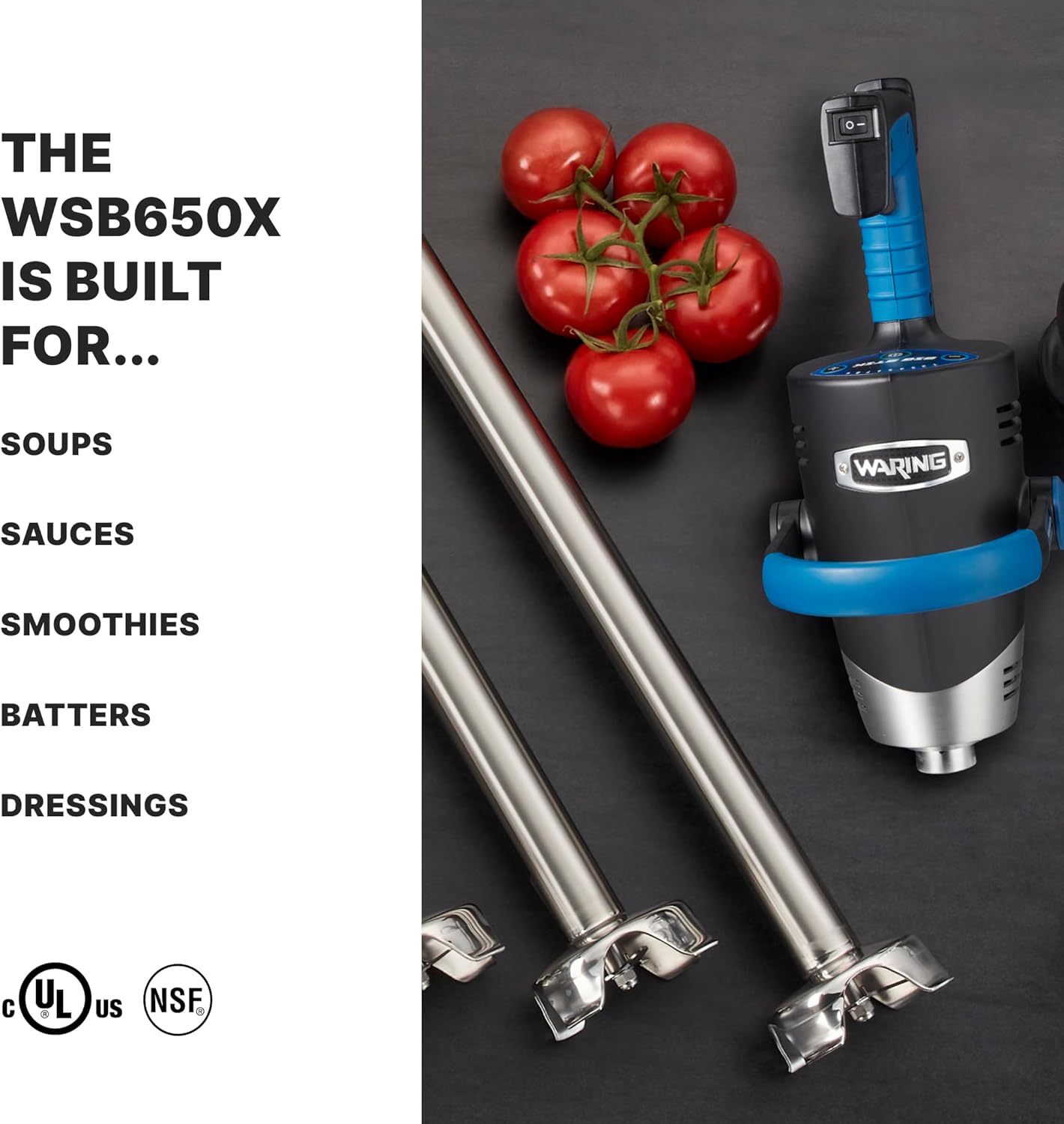 Transform your culinary creations with the Waring WSB650X Big Stik 18” Immersion Blender, boasting 1,145 watts of power for effortlessly smooth dressings, marinades, sauces, and soups in seconds. Featuring an easy-to-clean electronic control panel, this blender is ideal for mixing, pureeing, and emulsifying up to 35-gallon batches with ease and precision. LEDs light up on the control panel as blender speed increases. Hold the sturdy control handle or use an accessory bowl clamp (WSBBC) for hands-free operation. The sealed 18" inch stainless steel shaft is easily removable and dishwasher safe.