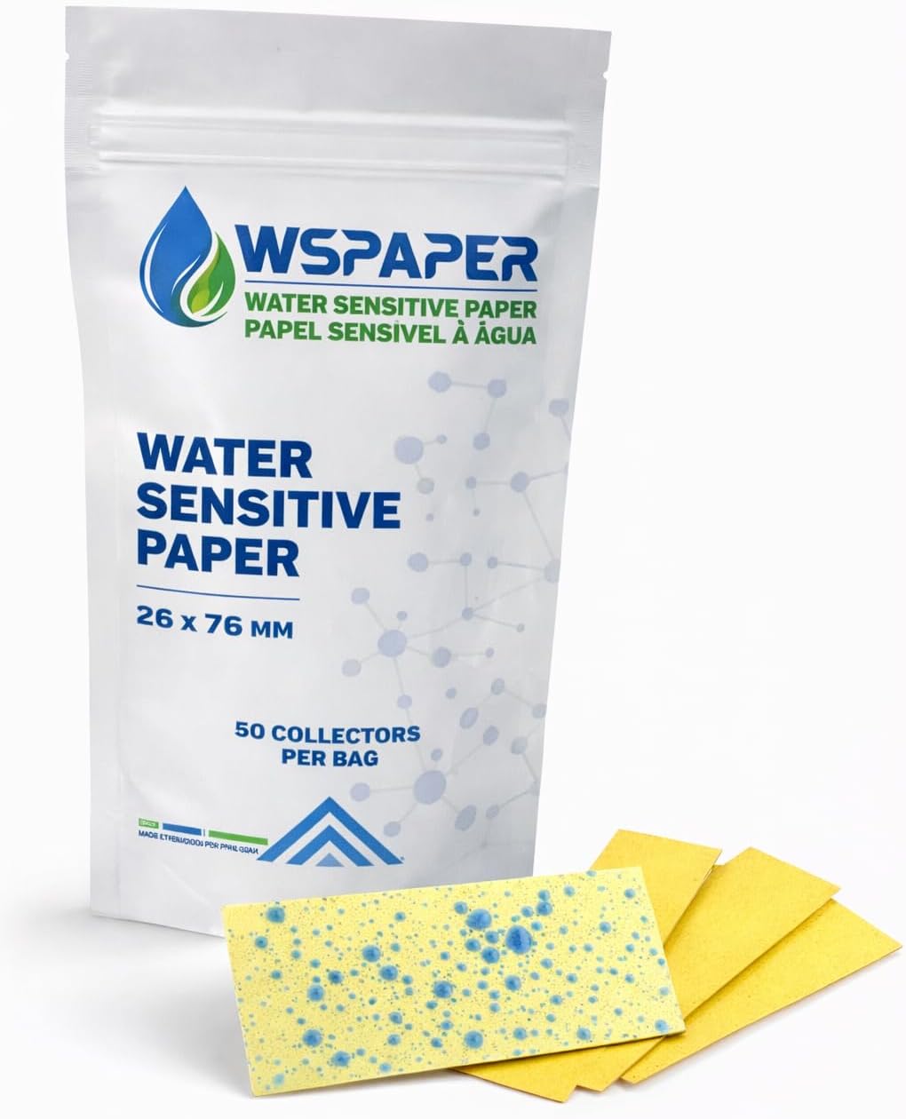 The Water Sensitive Paper is specially coated to assess the distribution and coverage of droplets in liquid product applications, such as in agriculture, environmental studies, and other areas. It visibly reacts upon contact with water-based droplets, changing from bright yellow to blue, making it easier to analyze coverage and application accuracy. Ideal for calibrating distribution equipment and ensuring uniform coverage, this paper enables professionals to optimize the efficiency of liquid product applications and minimize waste. It is an essential tool for achieving effective results in various projects, helping to ensure quality and uniformity across target areas. Precise Sprayer Calibration: Our Water Sensitive Paper ensures even droplet distribution in sprayer calibrations, reducing waste and increasing efficiency. Quick and Accurate: Each sheet reacts rapidly to water, offering fast and reliable results for spray adjustments.