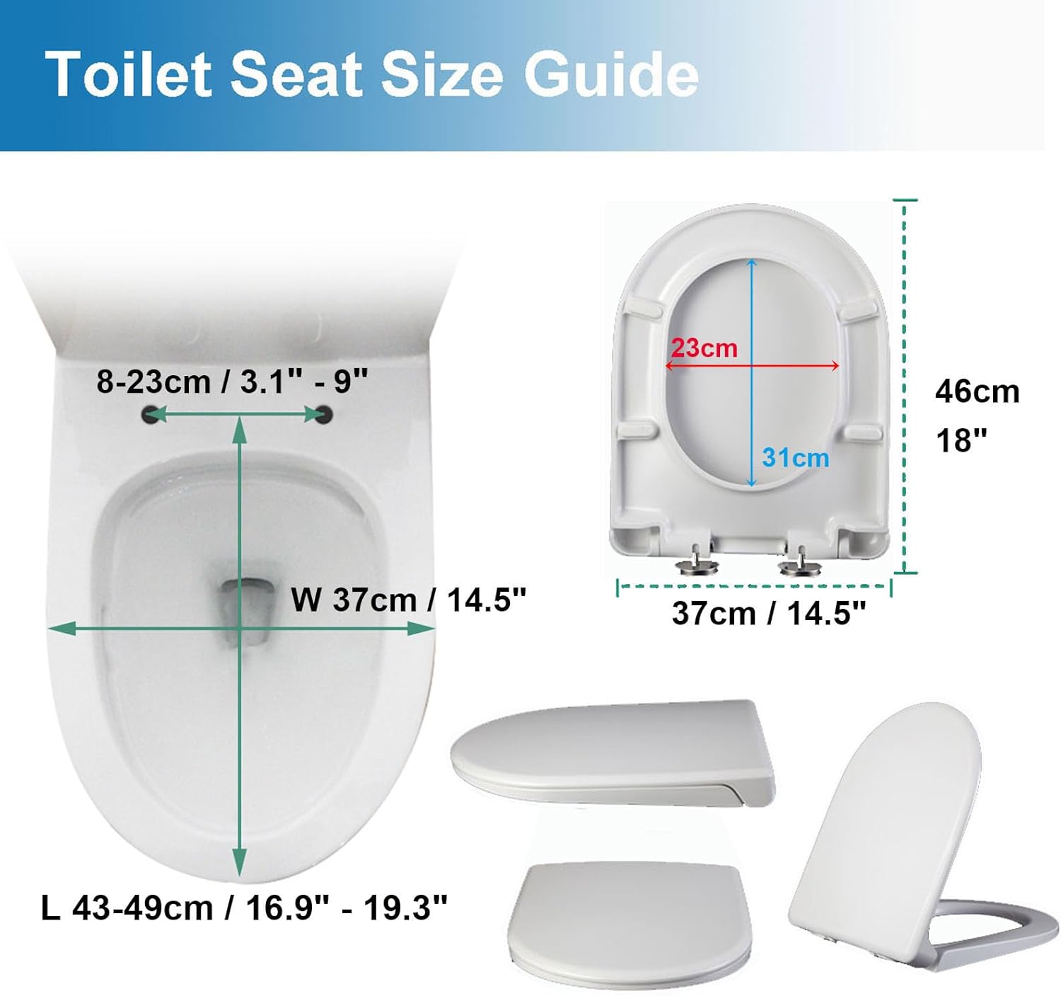 Product model: D shaped toilet seat / U shapebr/ br/ High-quality, high-stability and U-shaped toilet seat.br/ This toilet seat is made of high-quality PP material.br/ The color is always light, antistatic, scratch-resistant, non-flammable, and non-yellowing/fading.br/ Elegant and sophisticated design. br/ br/ The toilet seat has a slow closing function, which reduces noise, slowly descends, and does not damage the lid, giving you a more comfortable and fashionable experience.br/ br/ Easy To Install universal toilet seatbr/ Slow Down Mute Function toilet lidbr/ Quick Release Mechanism toilet seatbr/ br/ packing listbr/ D shape Toilet seat x 1br/ Aessories x 1